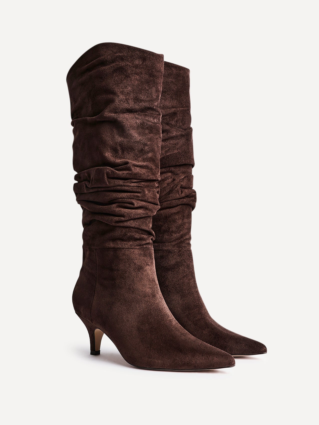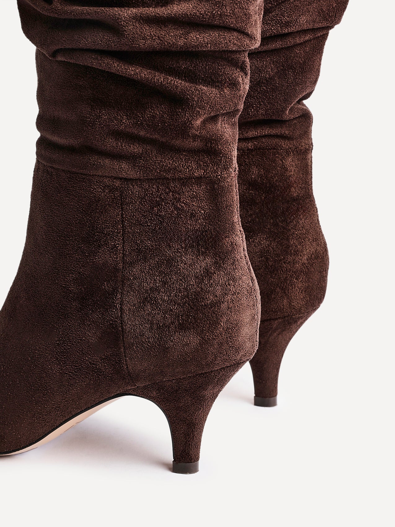Brown Faux Suede Ruched Kitten Heel Knee High Boot
