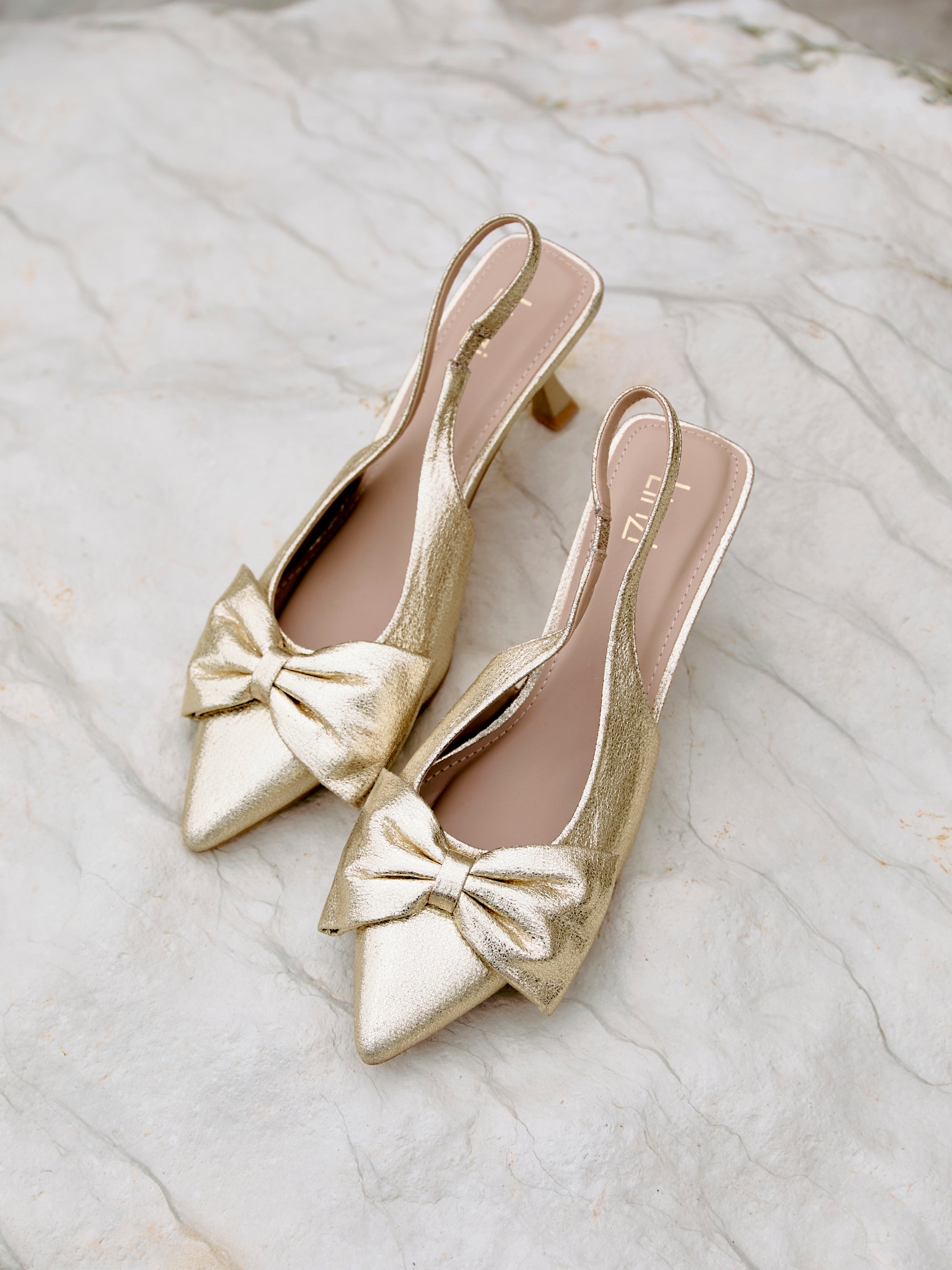 Gold Faux Leather Slingback Court Heels With Bow Detail