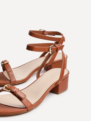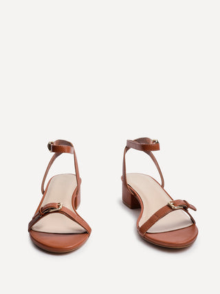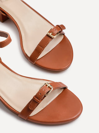 Tan Faux Leather Low Block Heeled Sandal With Buckle Detail