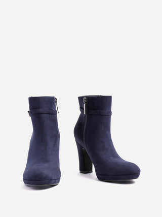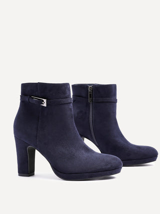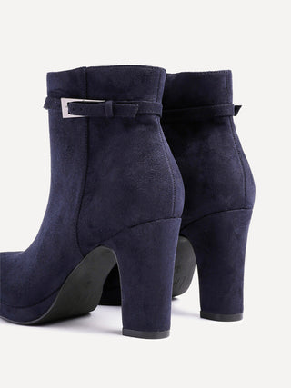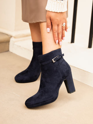 Navy Faux Suede Heeled Ankle Boot With Buckle Accent