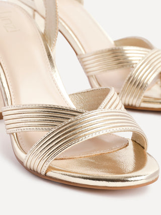 Gold Faux Leather Block Heeled Sandal With Ribbed Design Front Strap