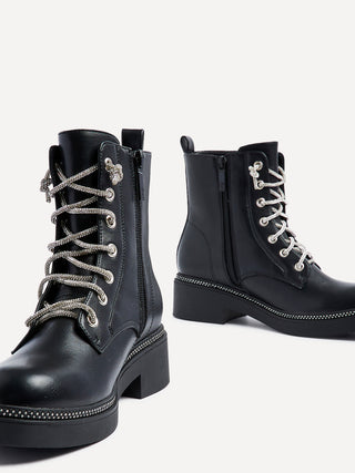 Black Faux Leather Military Style Boot With Diamante Laces