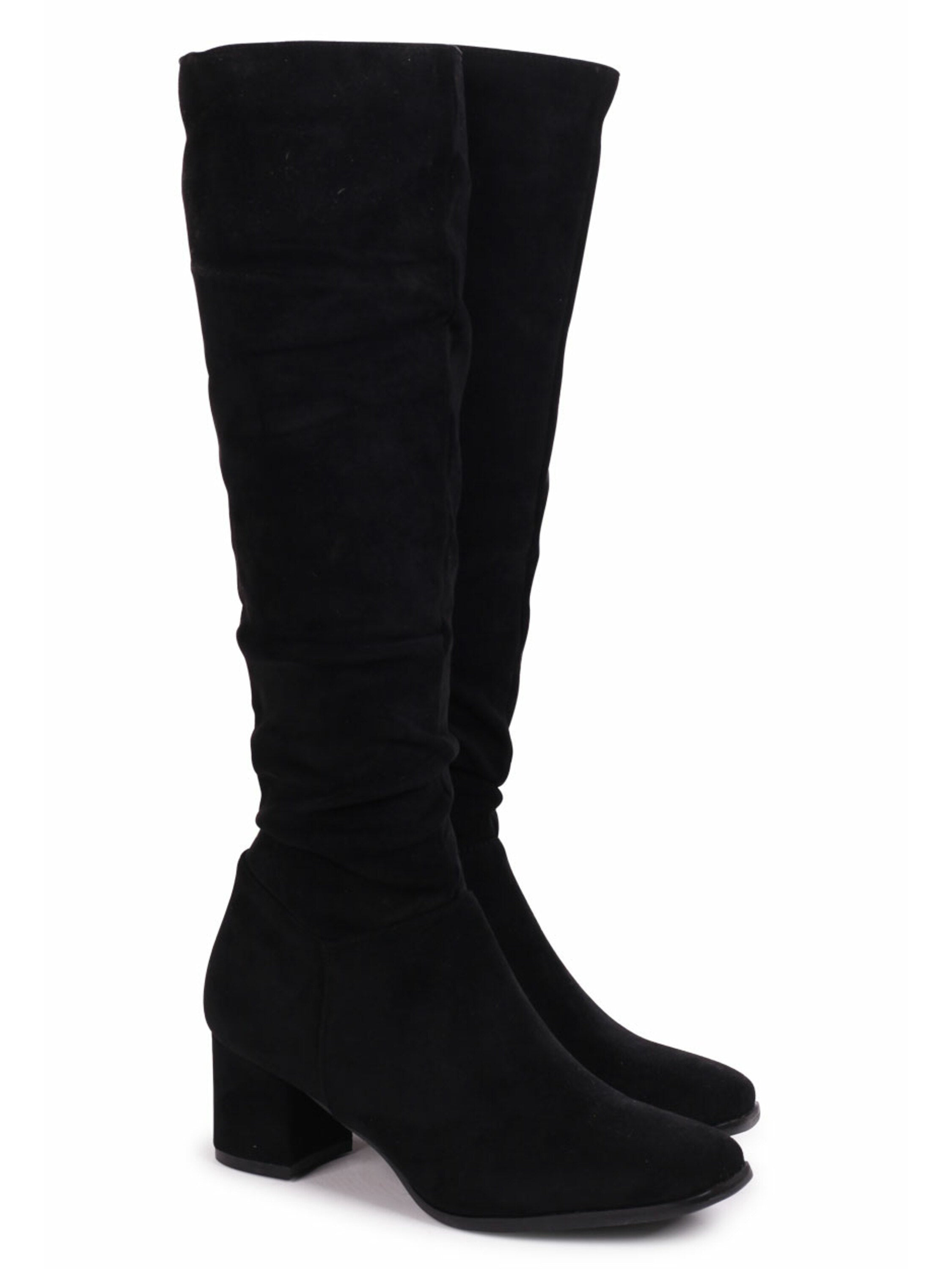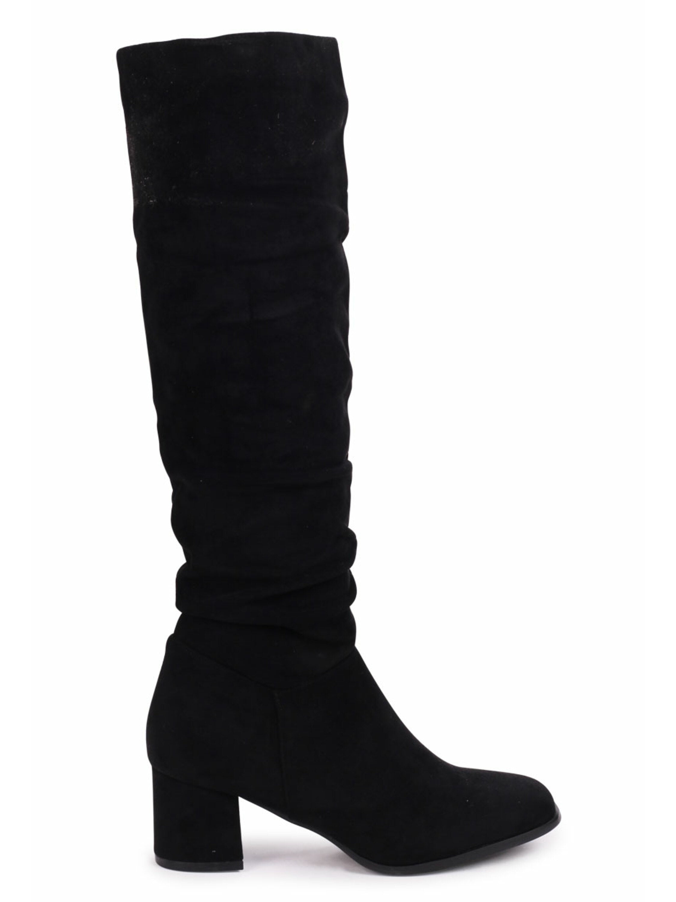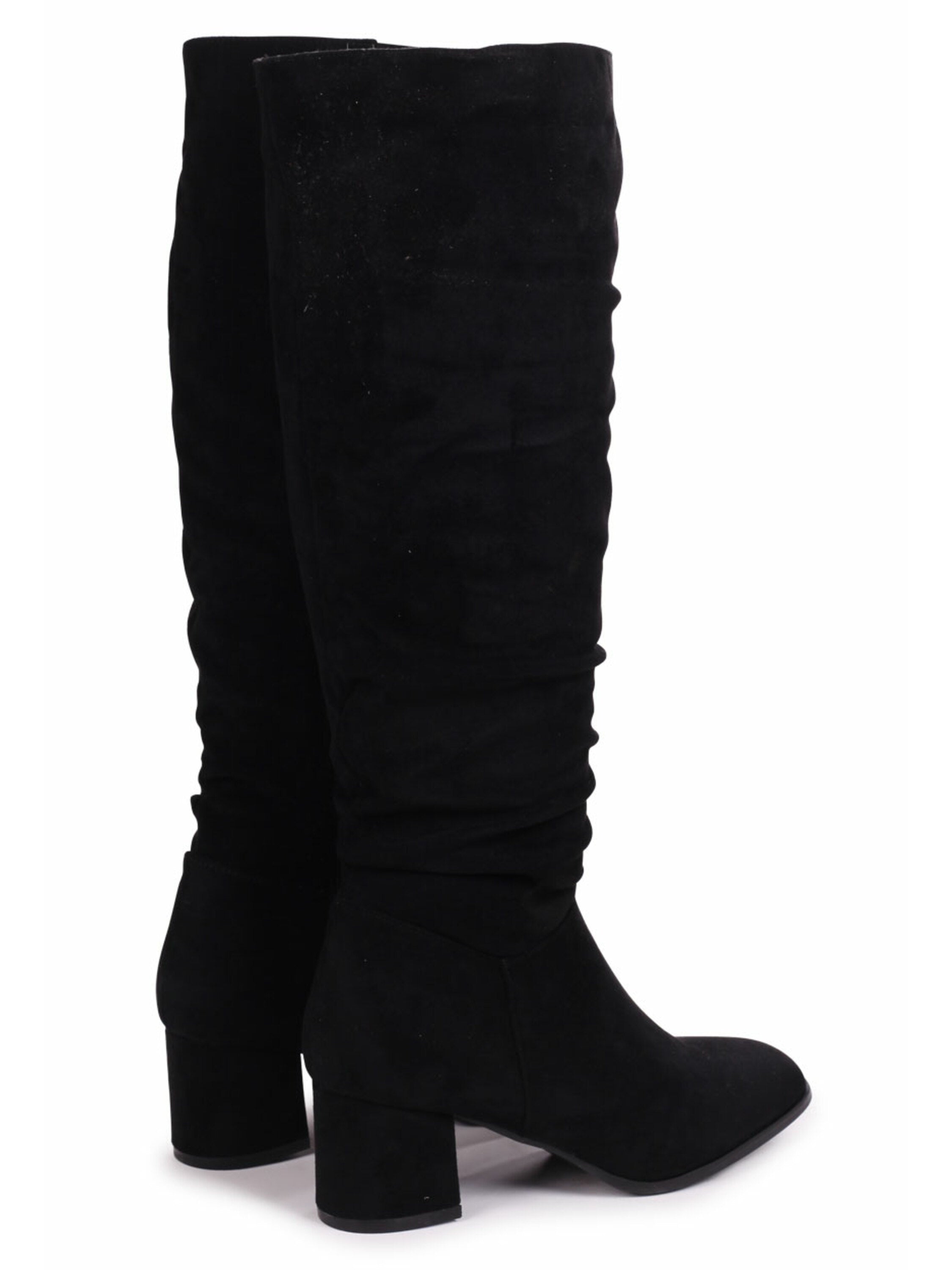 Black Faux Suede Block Heel Knee High Ruched Boot With Square Toe