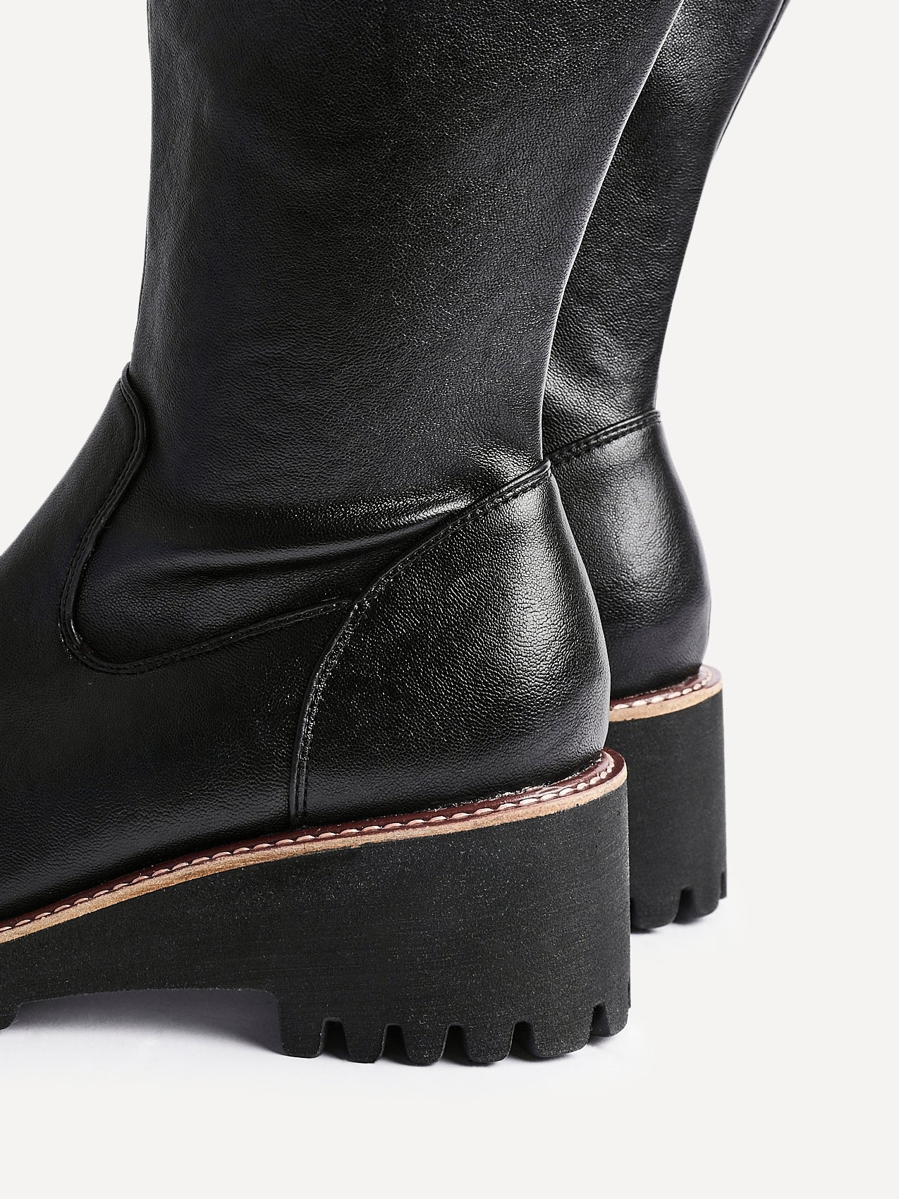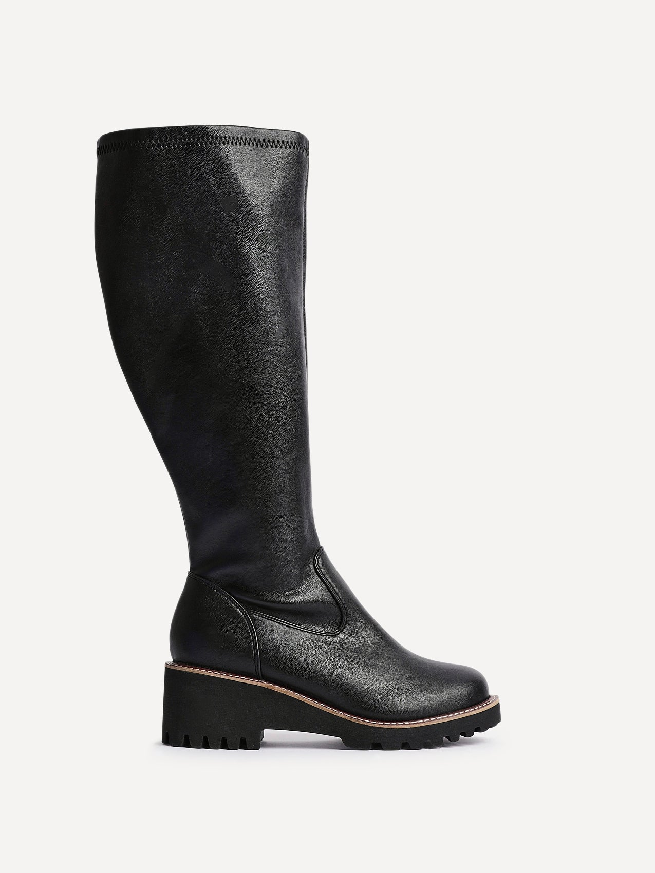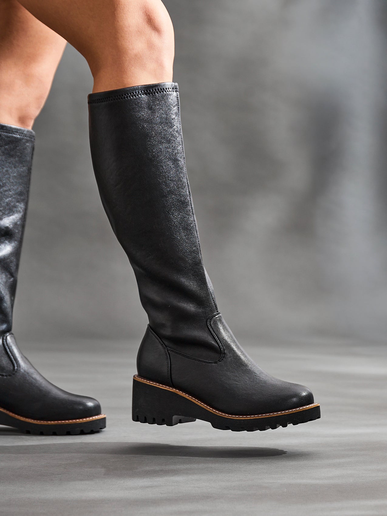 Elevate your everyday style with our Maintain wide fit boot. Designed for both comfort and style, it features a stretch calf-high leg for a flexible, flattering fit. Set on a 6cm wedge platform with stitched detailing around the sole, finished with a cushioned insole. Boot Length: 38.5cm