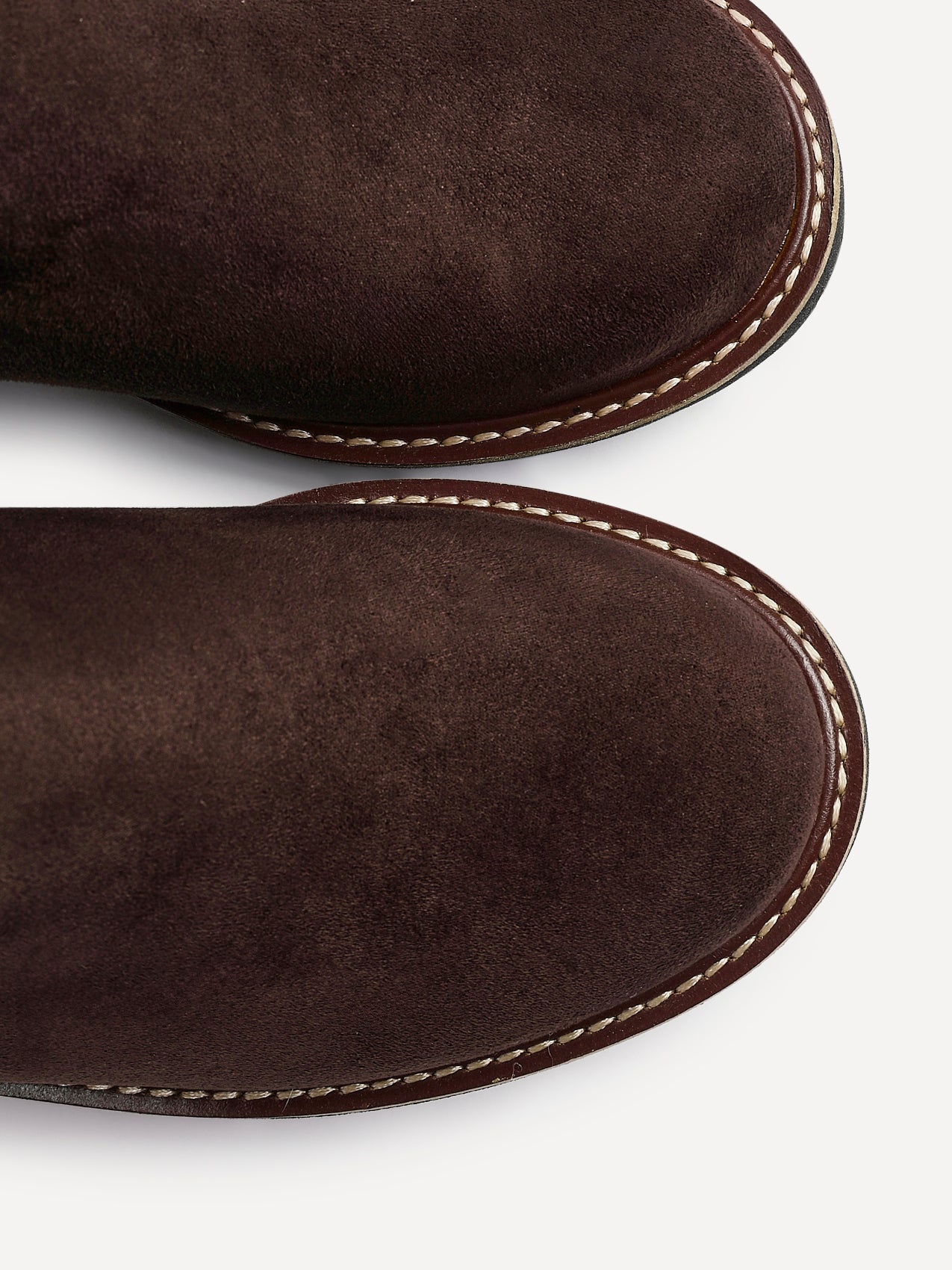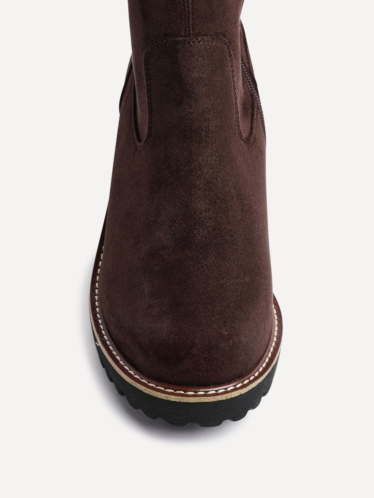 Wide Fit Brown Faux Suede Stretch High Leg Wedge Boot
