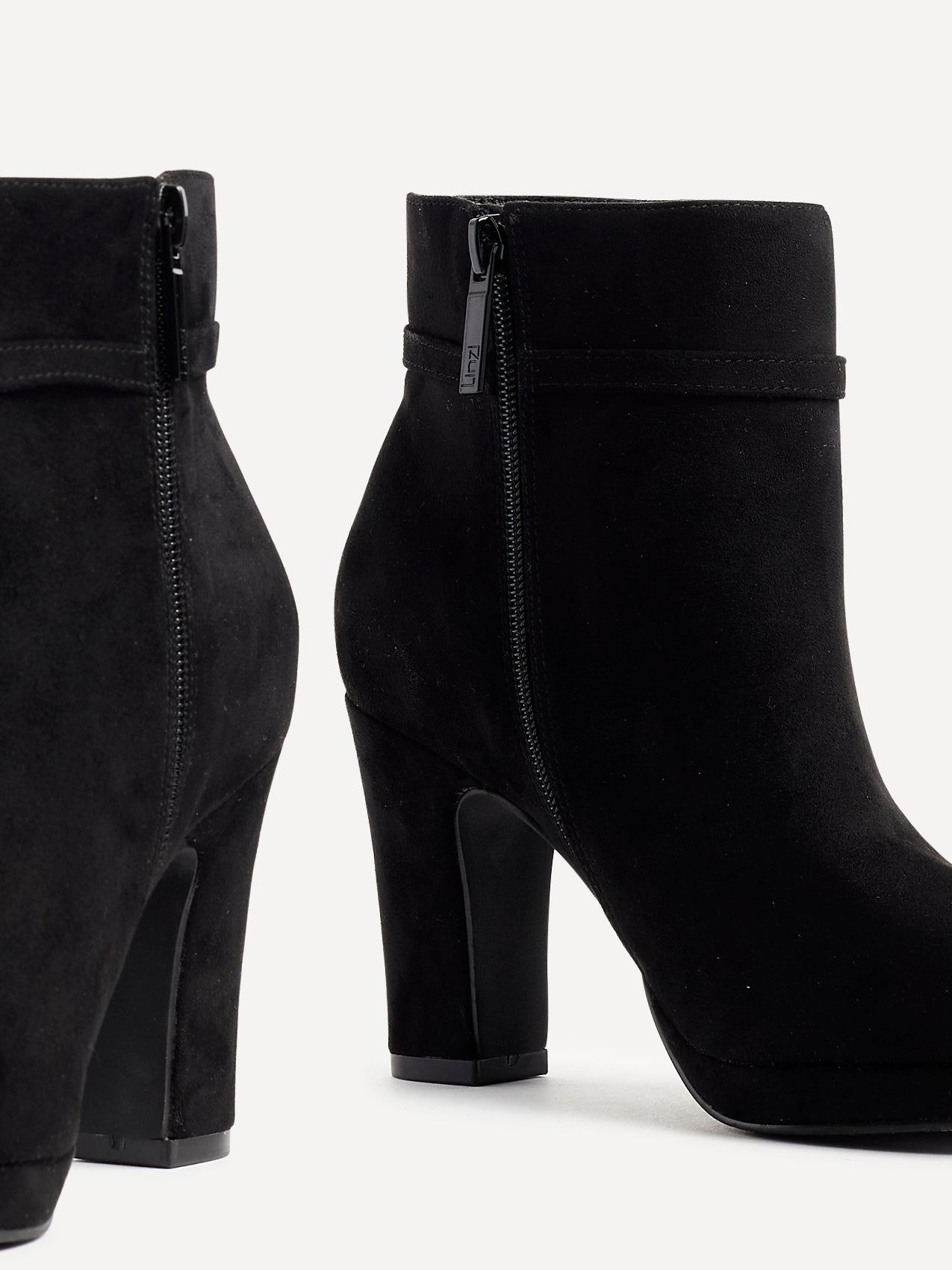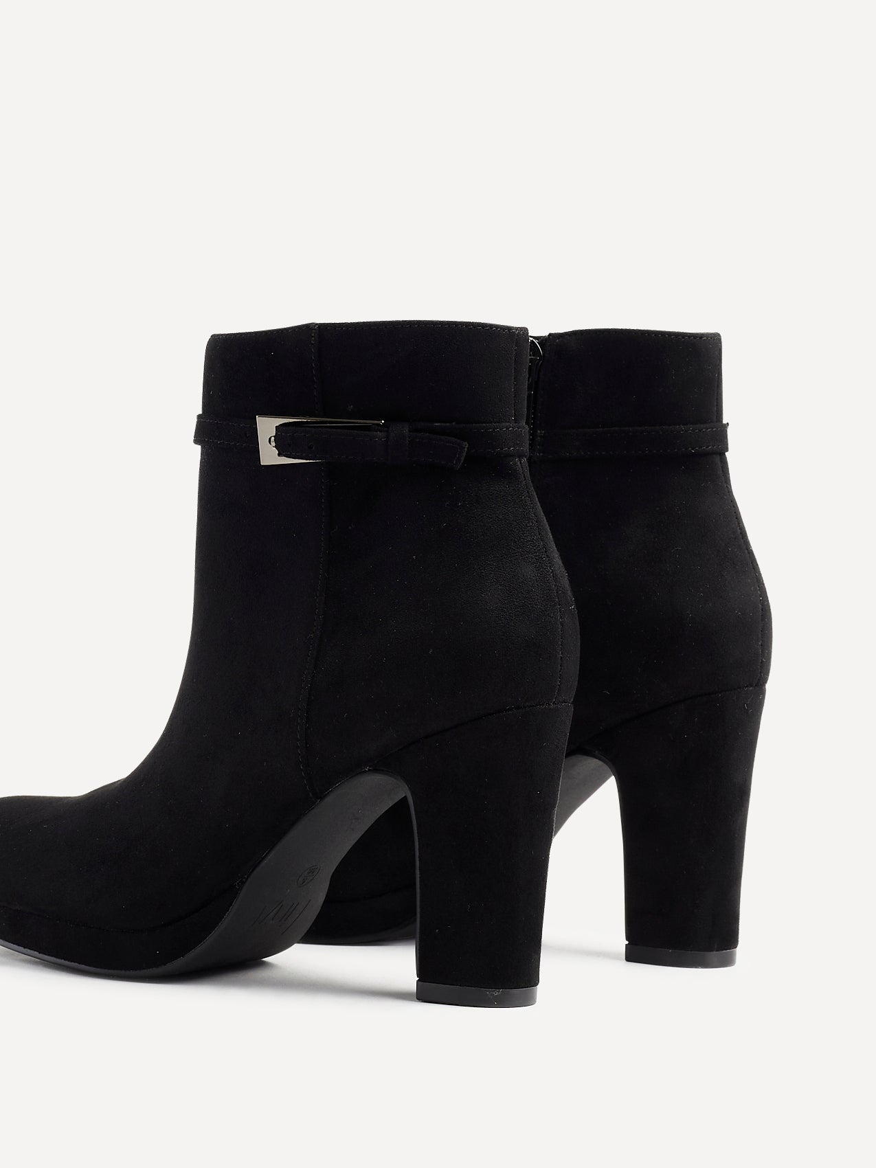 Black Faux Suede Heeled Ankle Boot With Buckle Accent