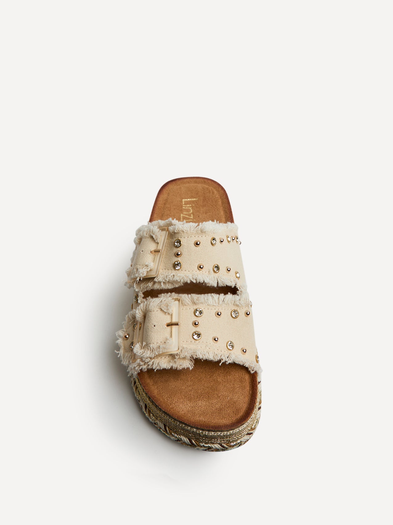 Beige Diamante Studded Double Buckle Flatform Slider Sandal