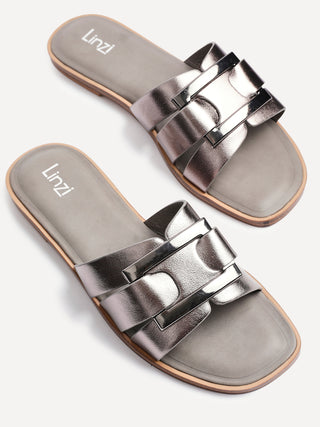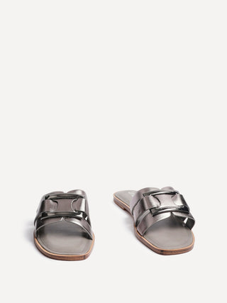 Pewter Faux Leather Buckle Flat Slider Sandal