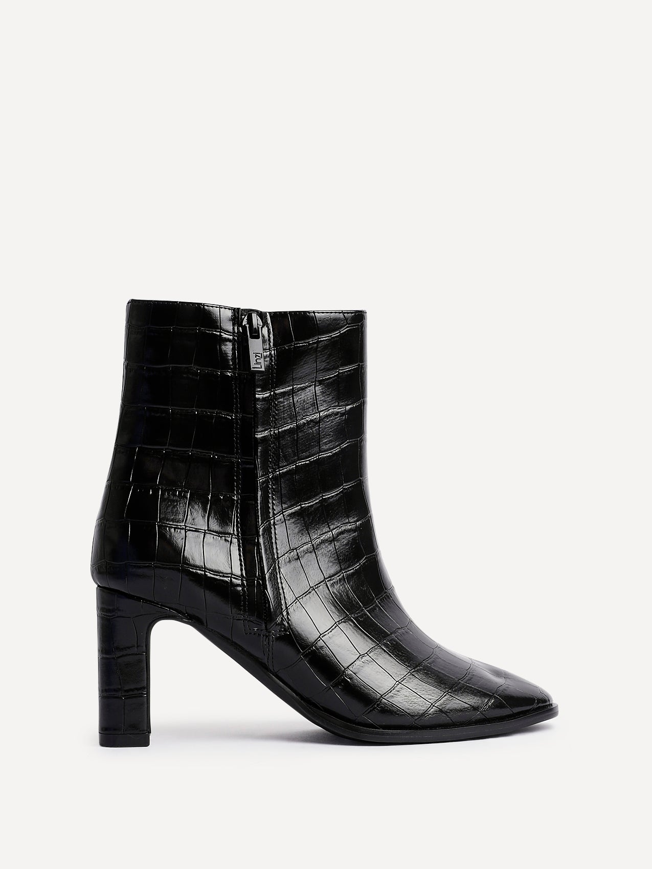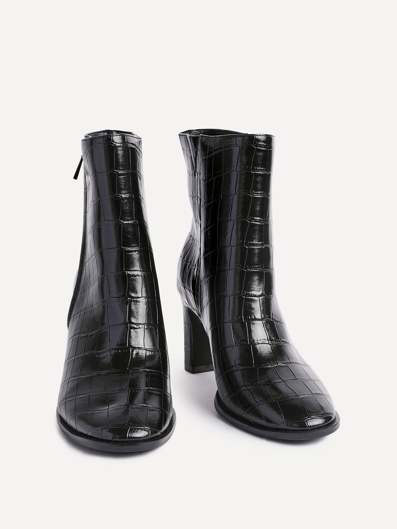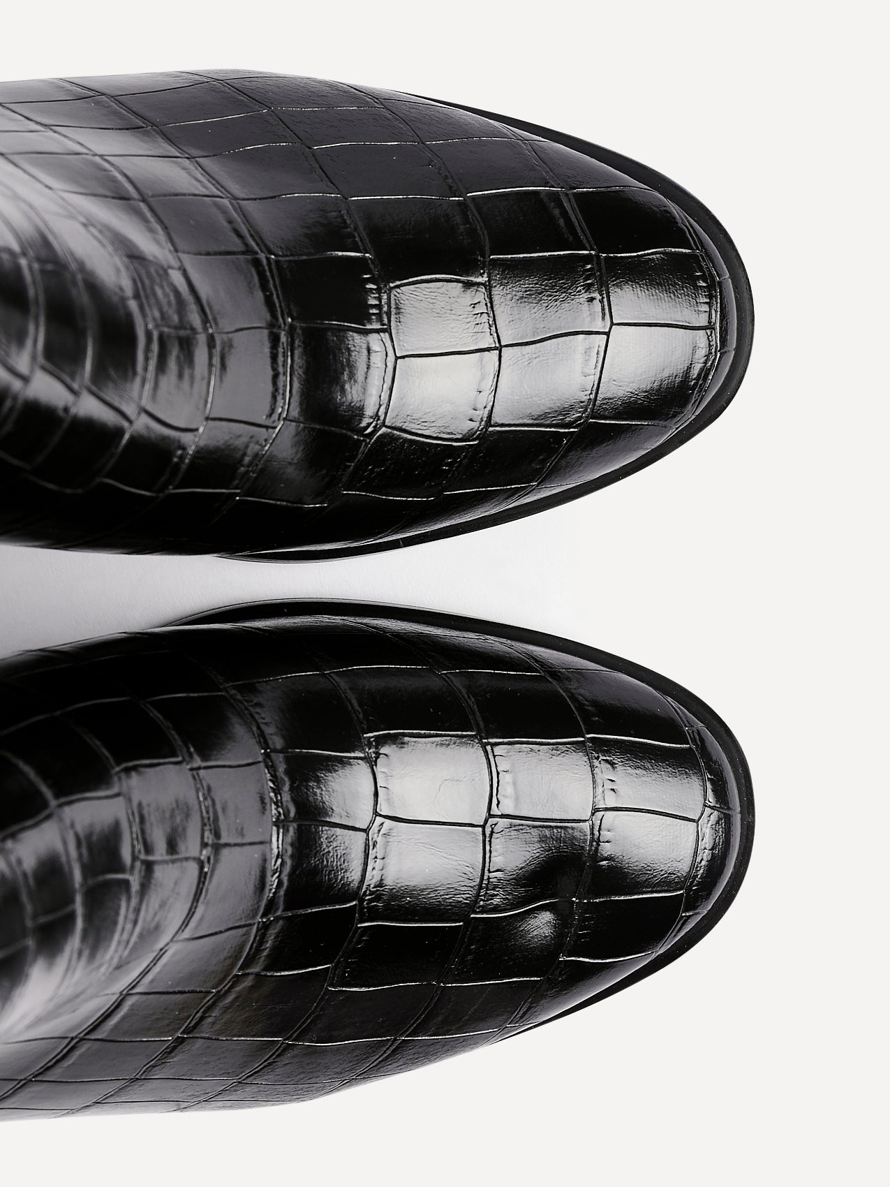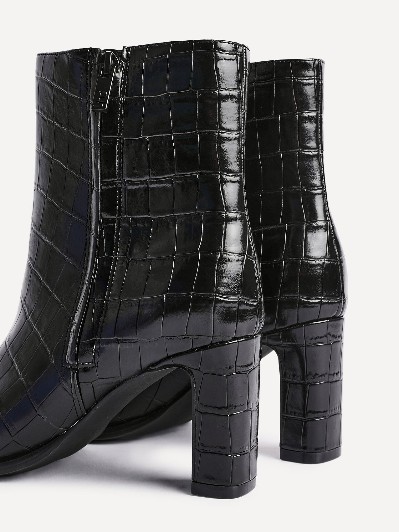 Black Faux Croc Patent Leather Block Heel Ankle Boot