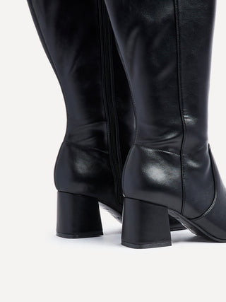 Wide Fit Black Faux Leather Knee High Block Heeled Boot