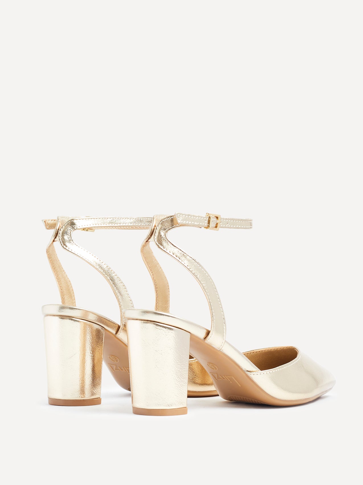 Gold Faux Leather Open Back Block Heeled Court Shoe