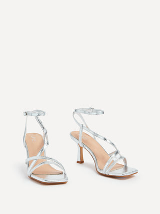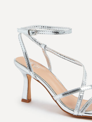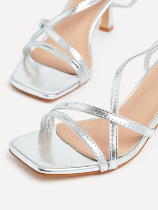 Silver Faux Leather Strappy Square Toe Heeled Sandal