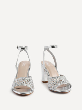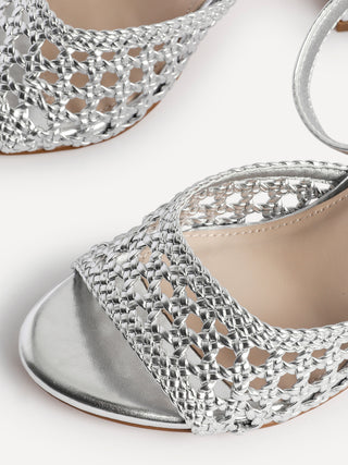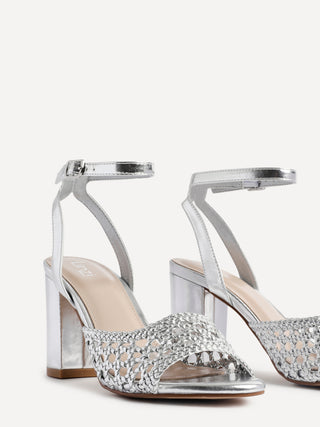 Silver Faux Leather Handwoven Block Heeled Sandal