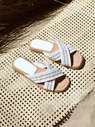 Add a touch of glamour to any summer outfit with our Genie sandals. Adorned with raffia embellished crossover straps, these sandals exude a sense of luxury. Indulge in the added comfort of a cushioned footbed.