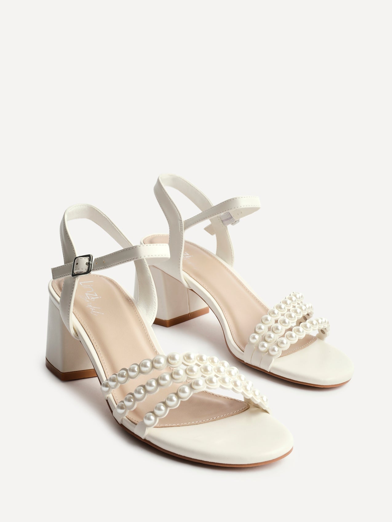 Ivory Faux Leather Pearl Embellished Heeled Sandals
