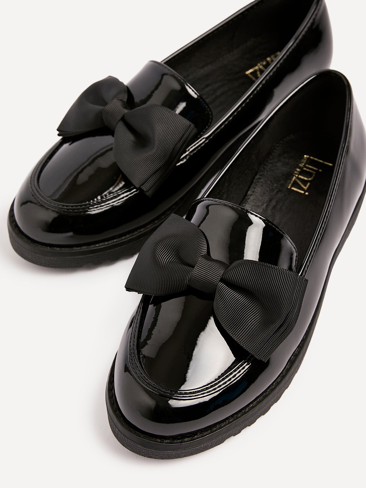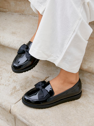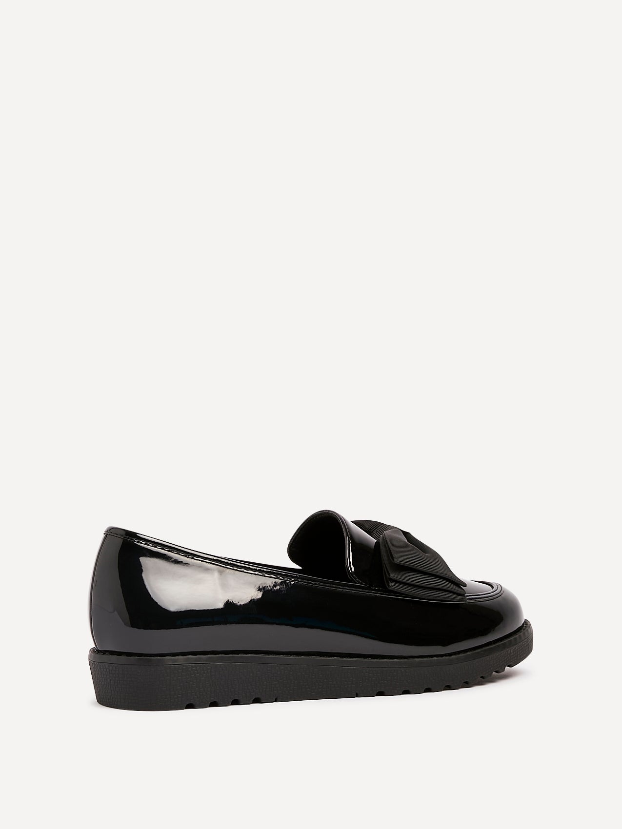 Wide Fit Black Patent Loafer With Fabric Bow Detail