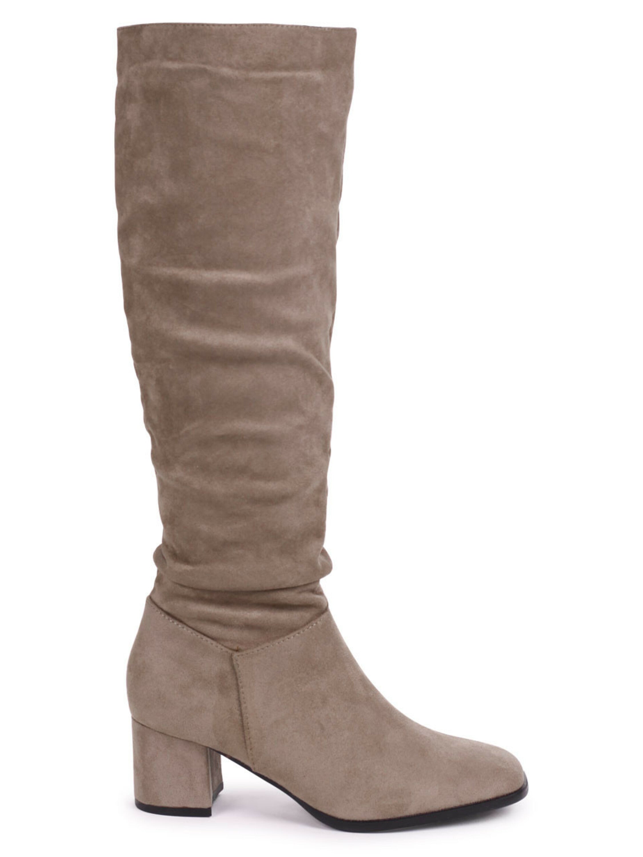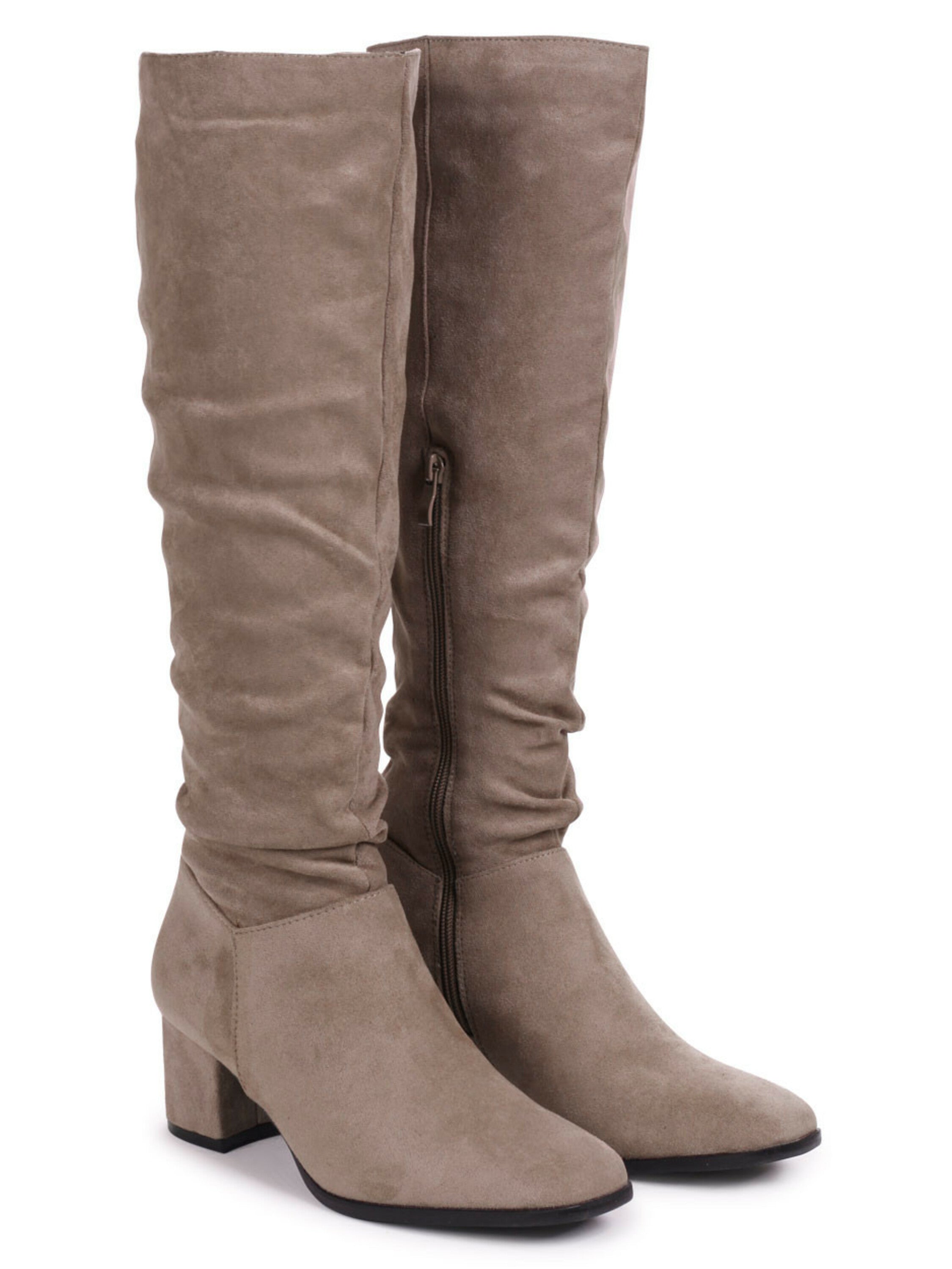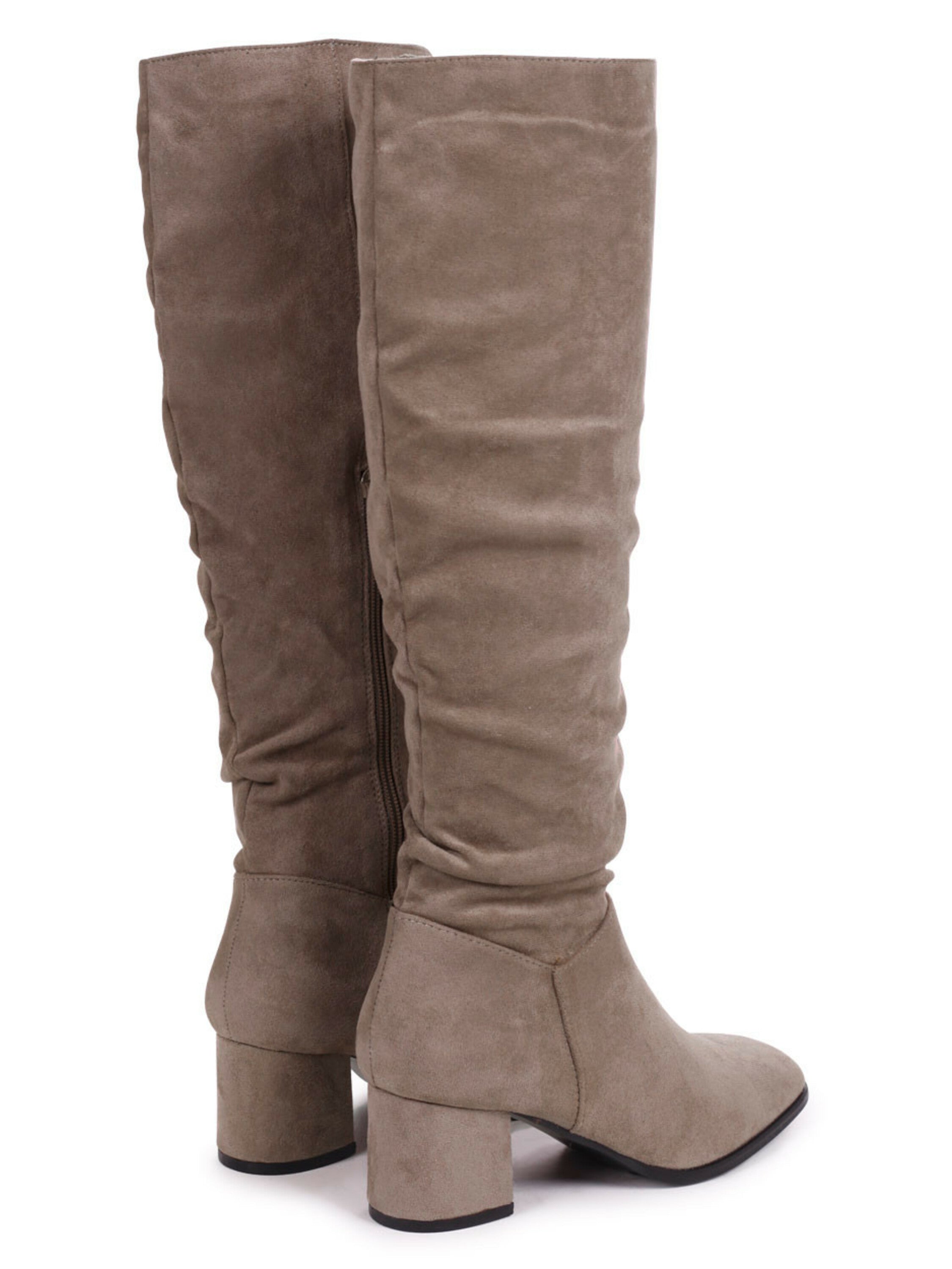 Mocha Faux Suede Block Heel Knee High Ruched Boot With Square Toe