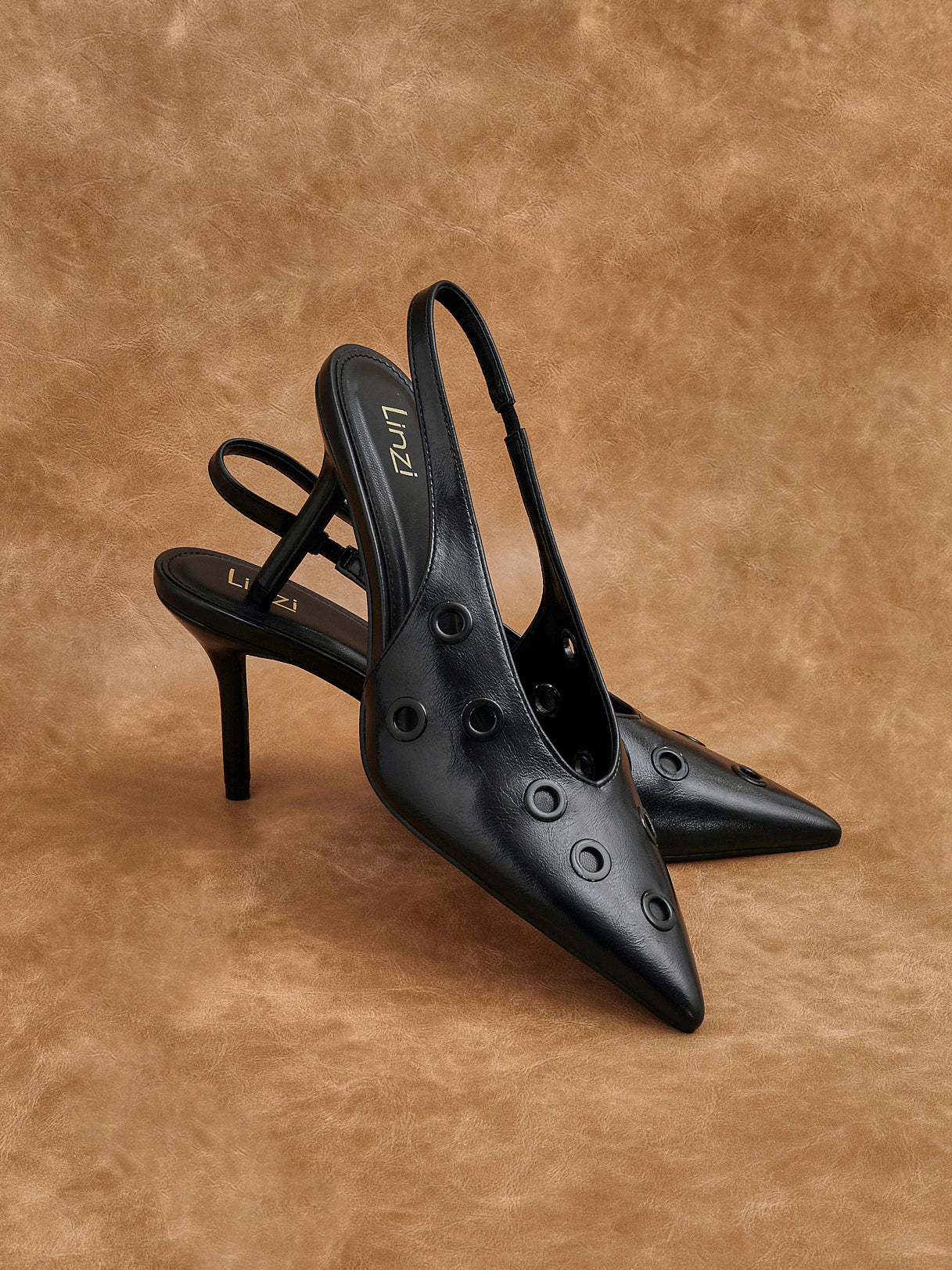 Our Abel court heels feature a pointed toe adorned with eyelet embellishments across the upper. Designed with a slingback strap and set on a sleek 8.5cm stiletto heel, complete with a cushioned insole for comfort.