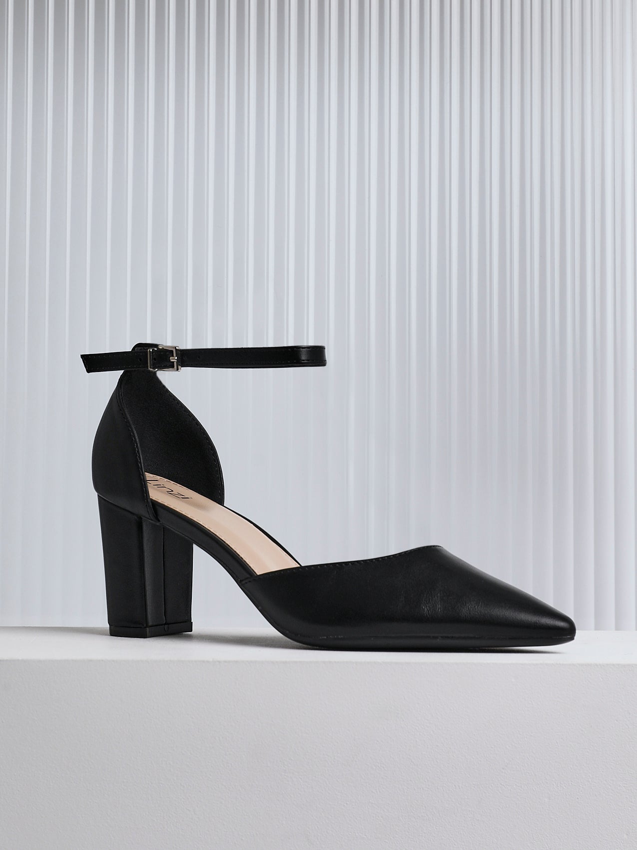 Black Faux Leather Closed Back Block Heeled Court Shoe