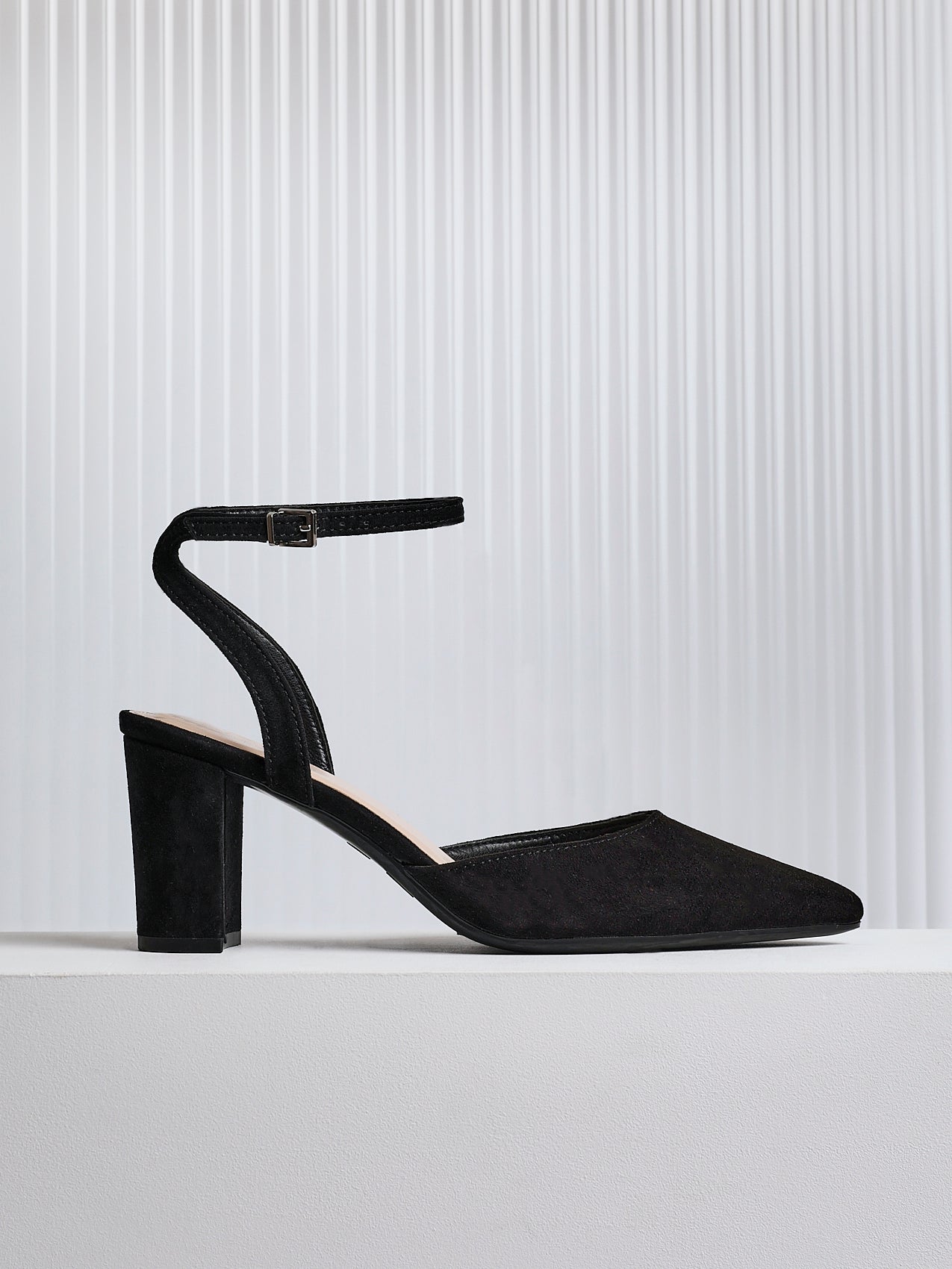 Black Faux Suede Open Back Block Heeled Court Shoe