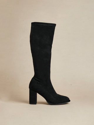 Black Stretch Suede Long Block Heeled Boot With Round Toe