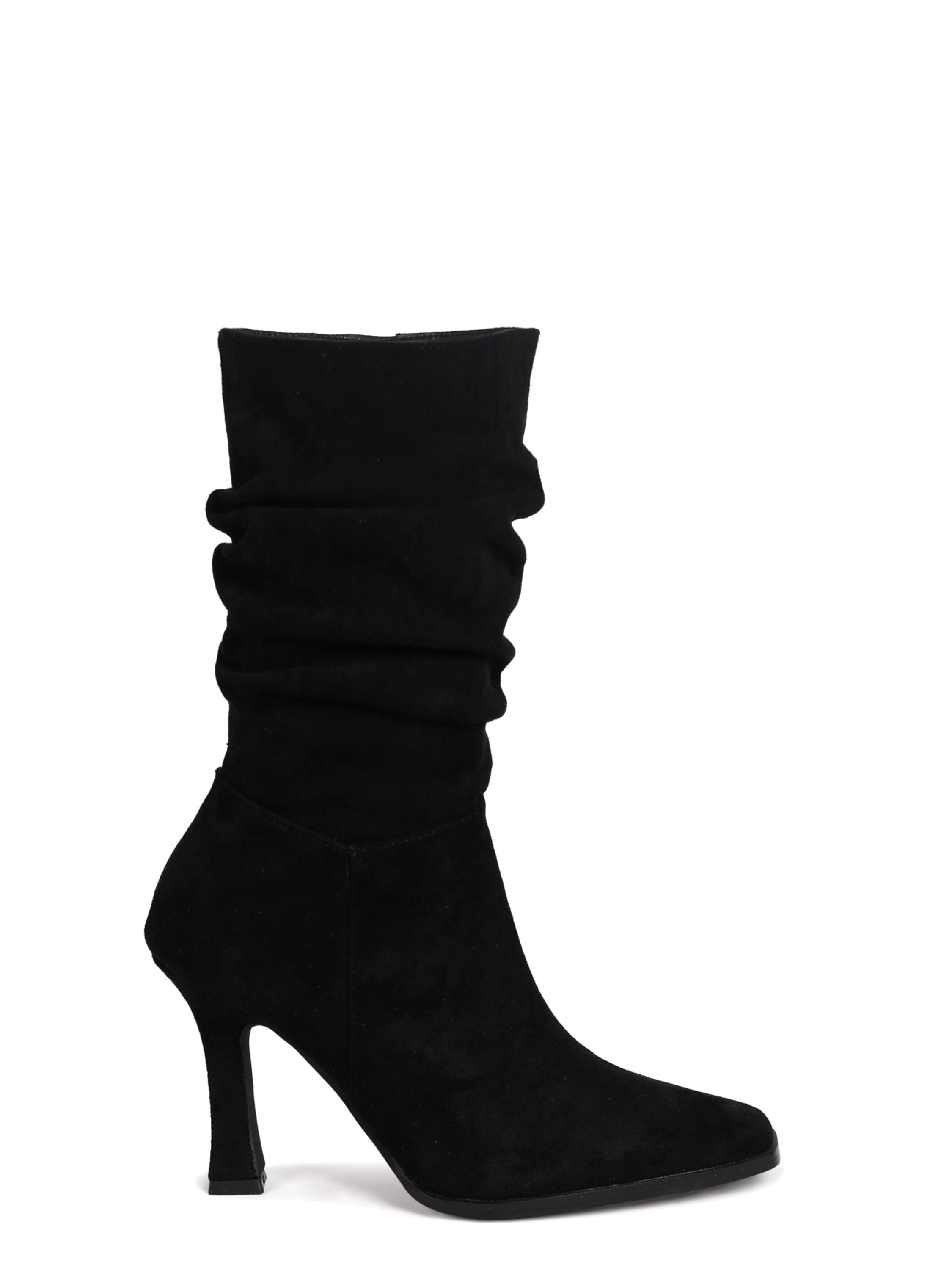 Black Faux Suede Mid Length Ruched Heeled Boot With Square Toe