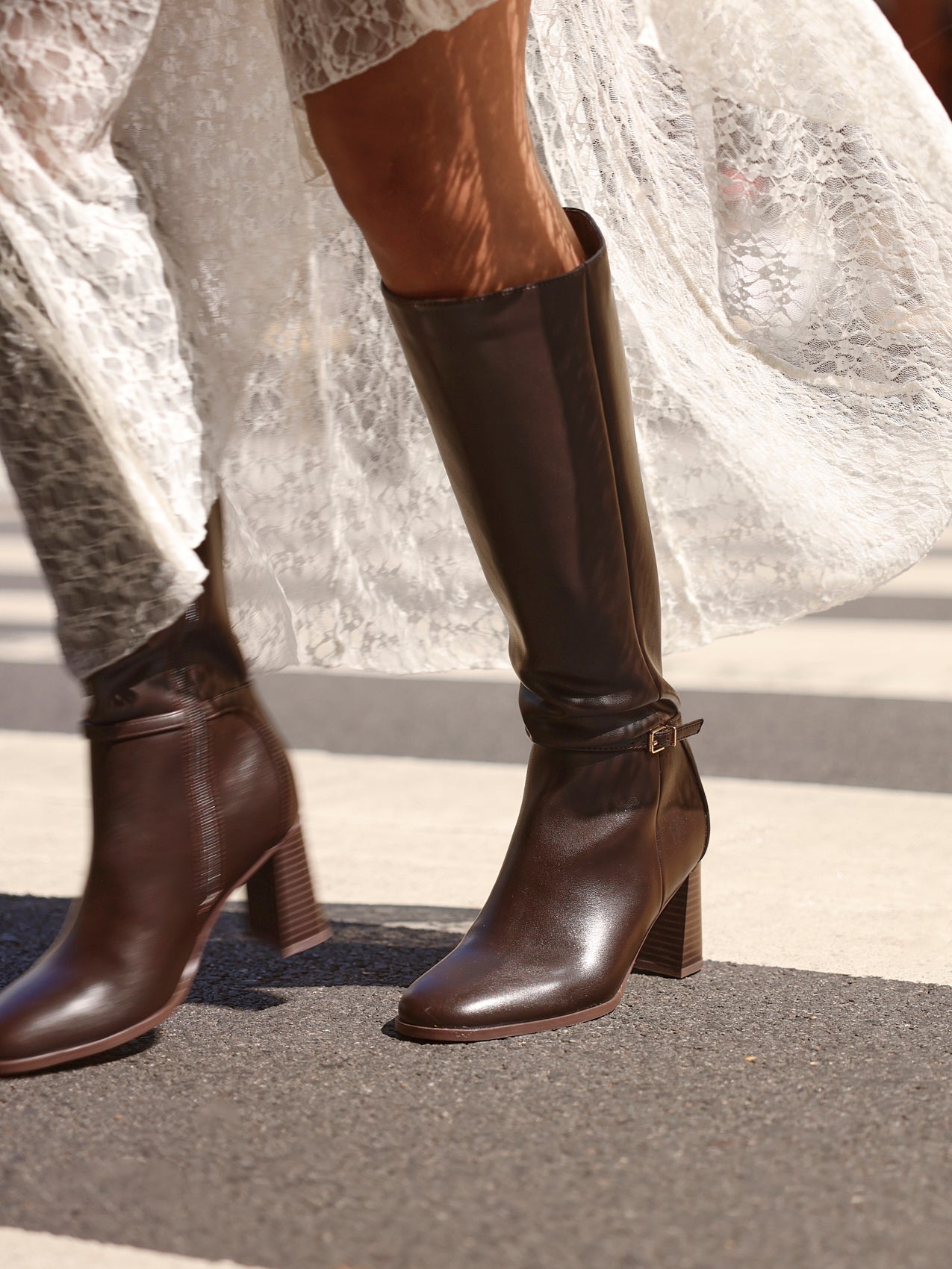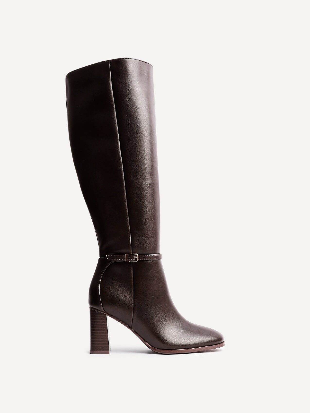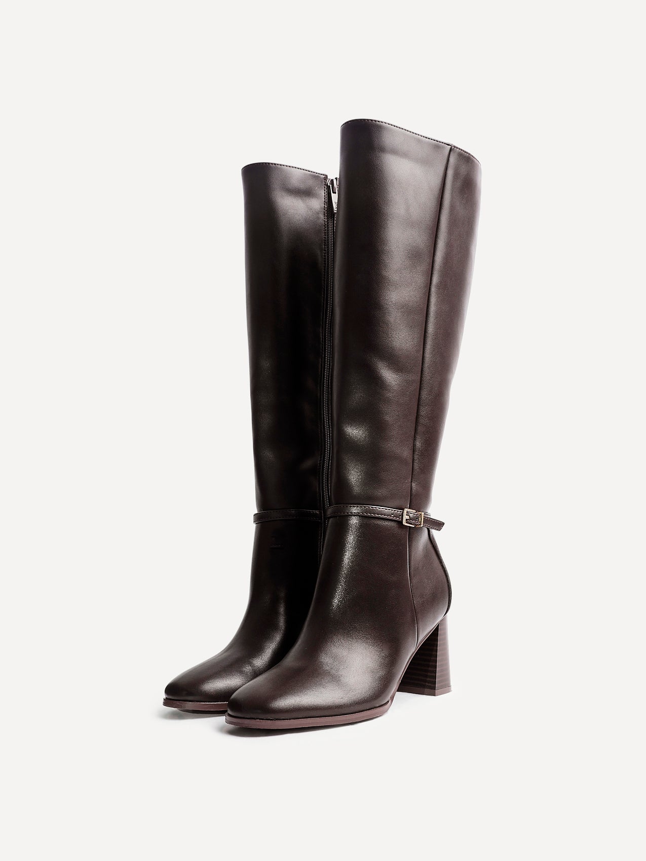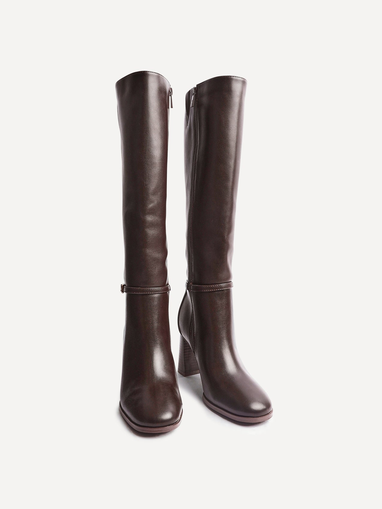 Brown Faux Leather Long Heeled Boot With Buckle Detail