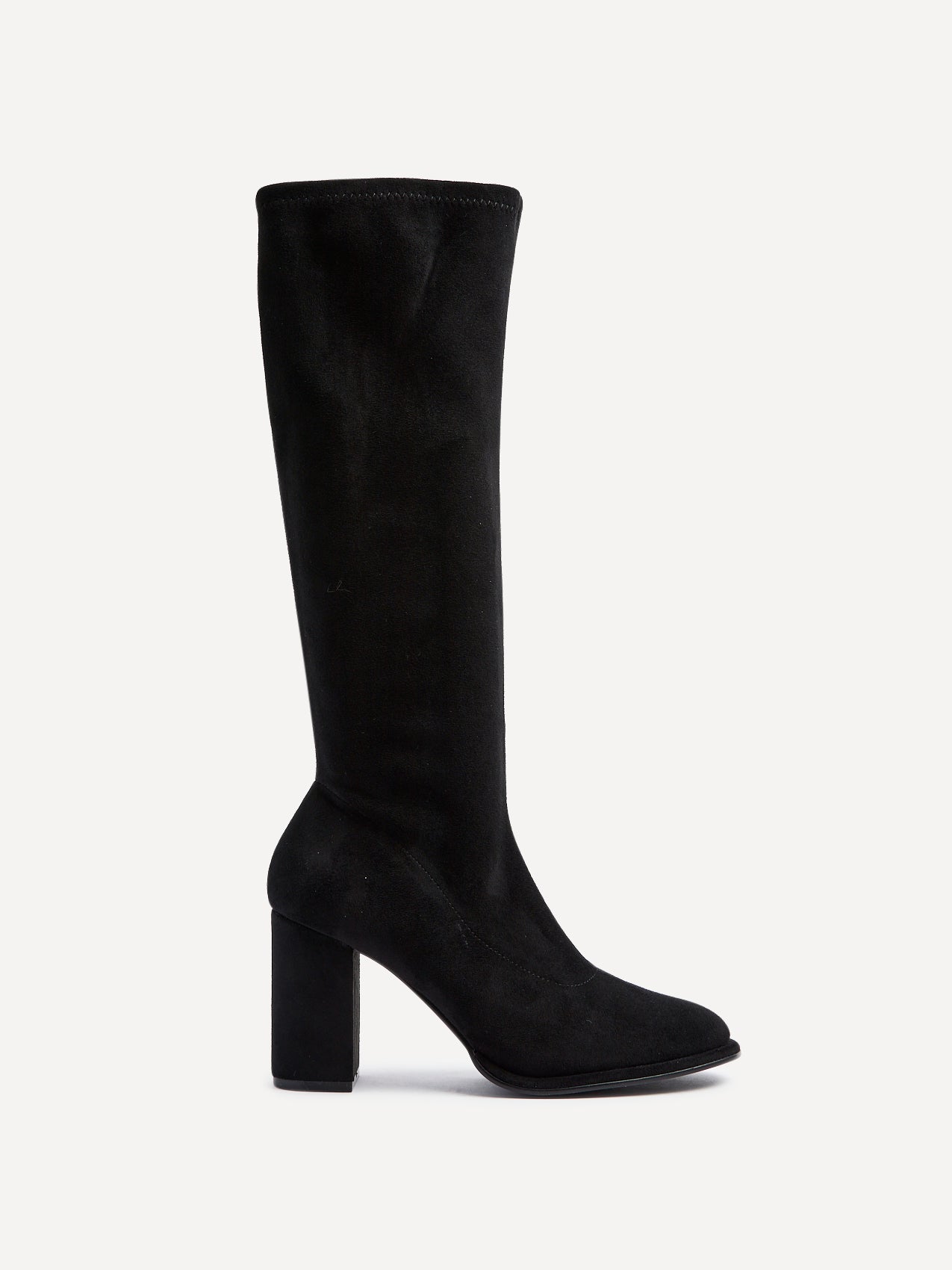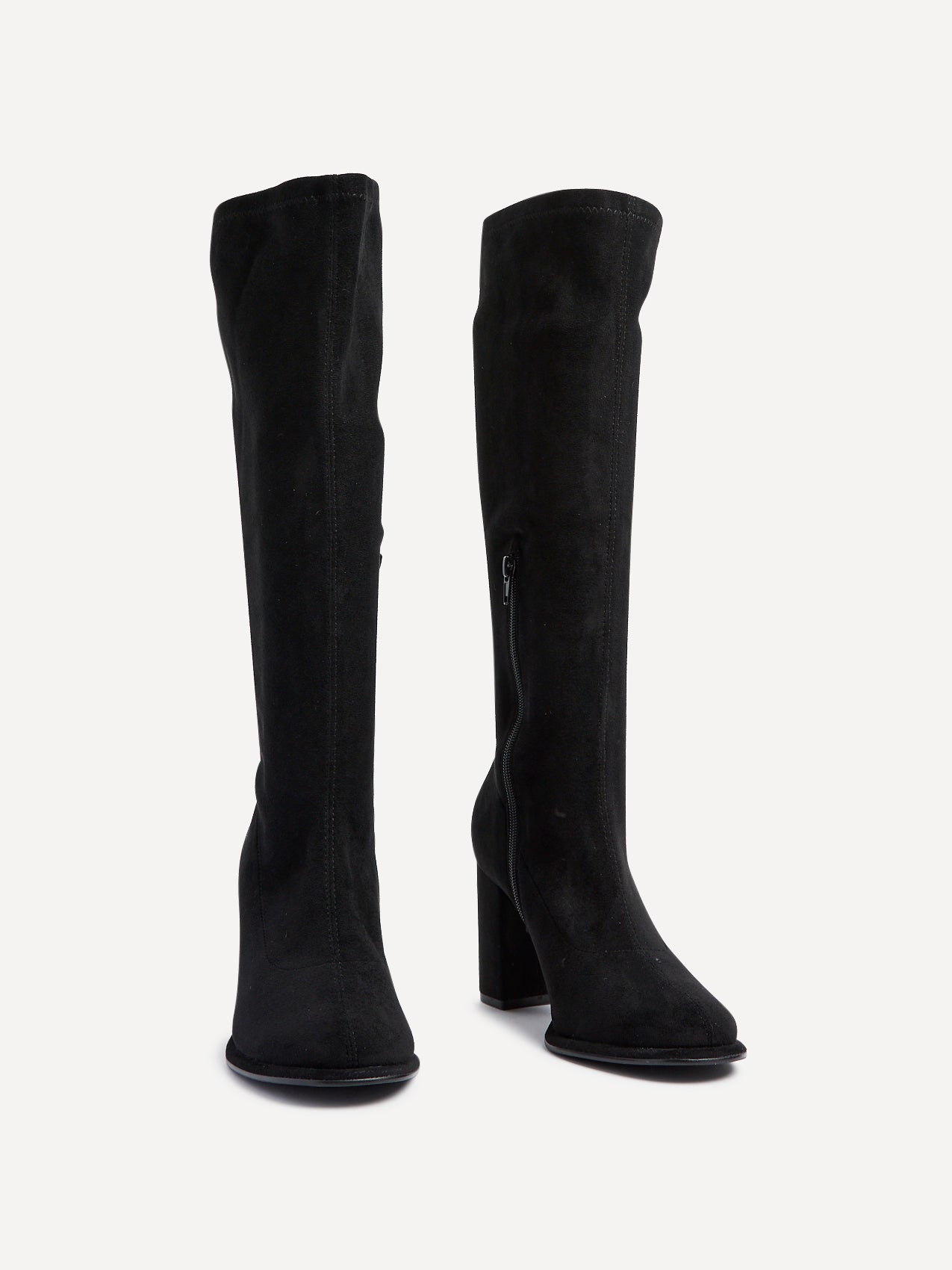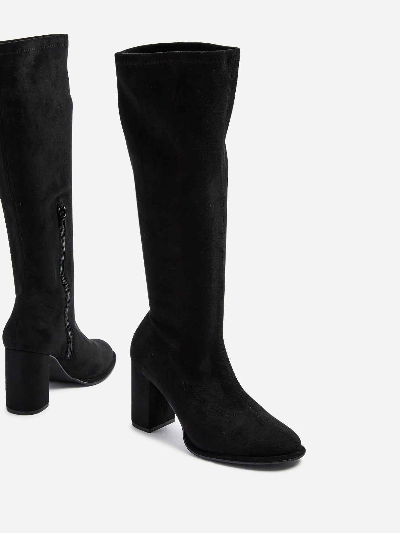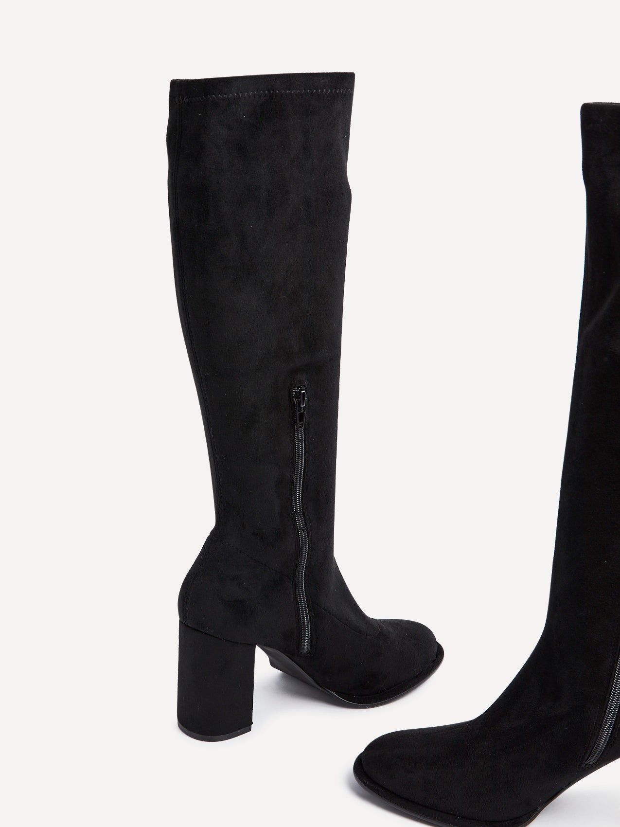 Black Faux Stretch Suede Long Block Heeled Boot With Round Toe