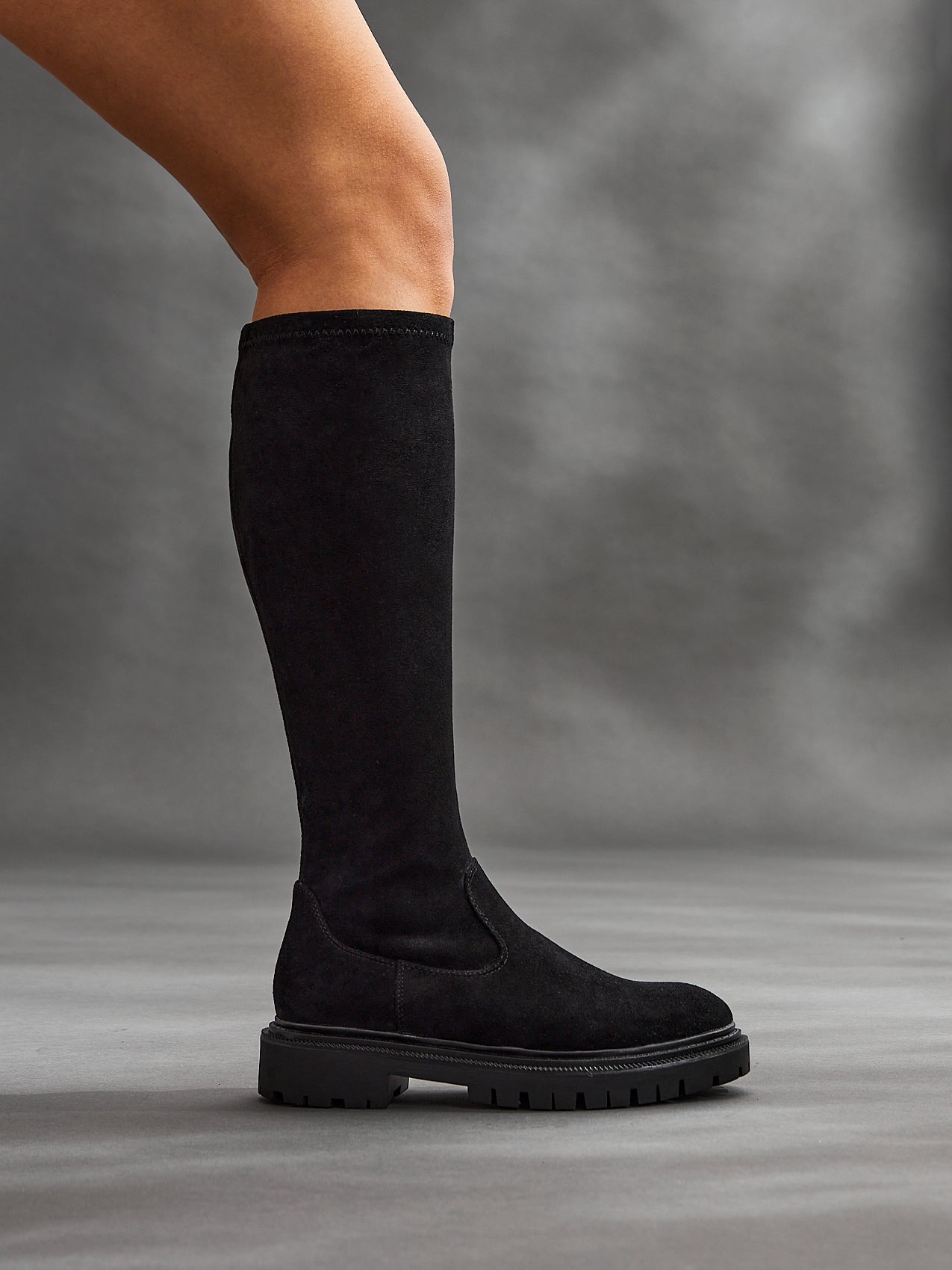 Black Faux Suede High Leg Stretch Boot With Chunky Sole