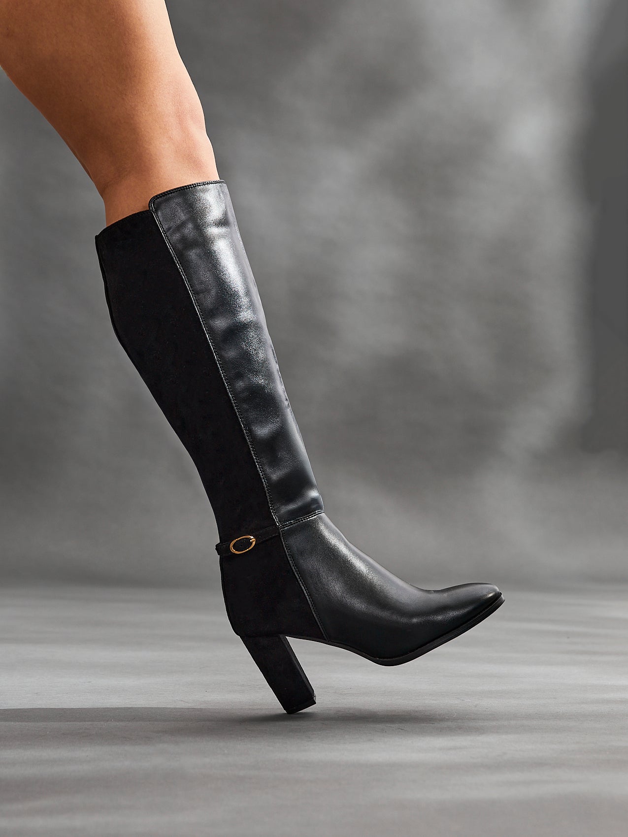 Black High Leg Block Heeled Boot With Buckle Detail