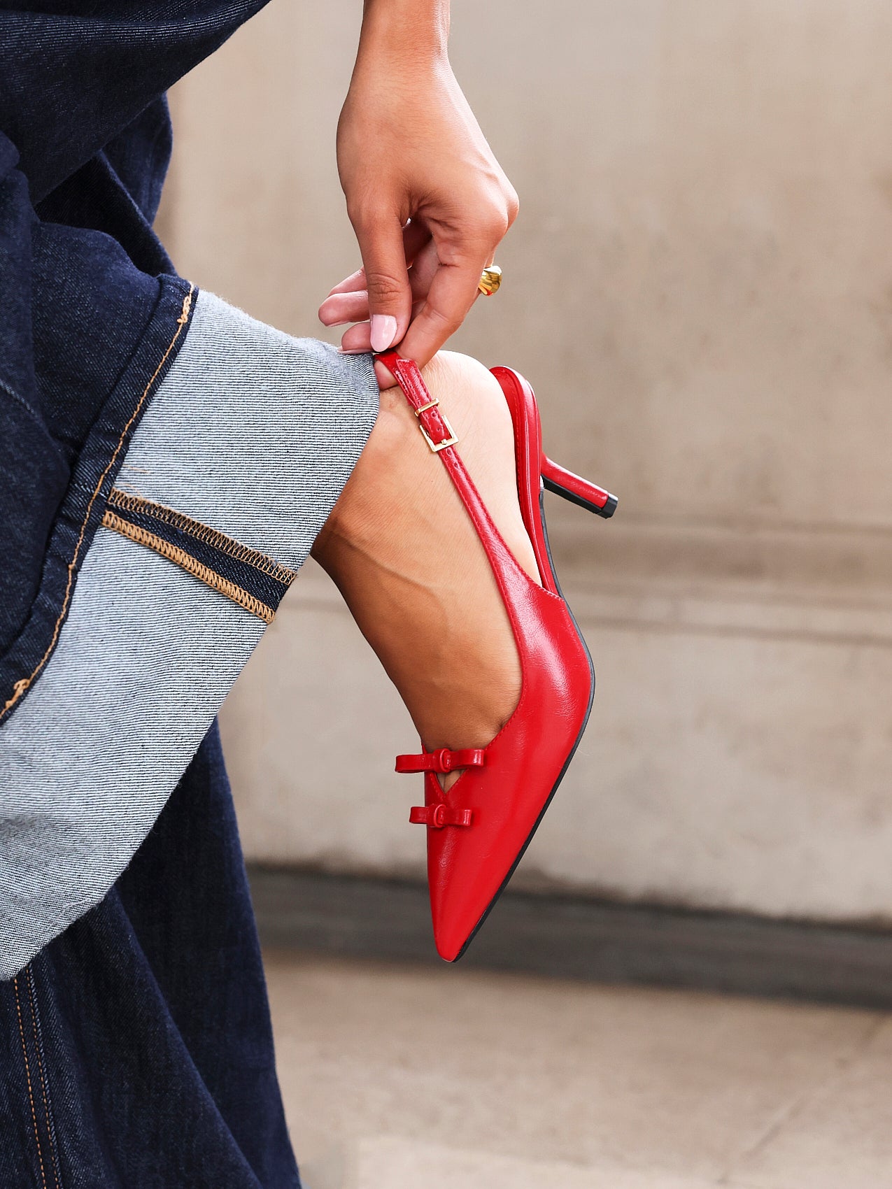 Red Faux Leather Court Heels With Double Bow Detail