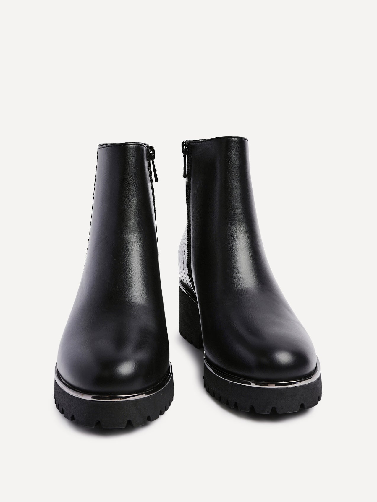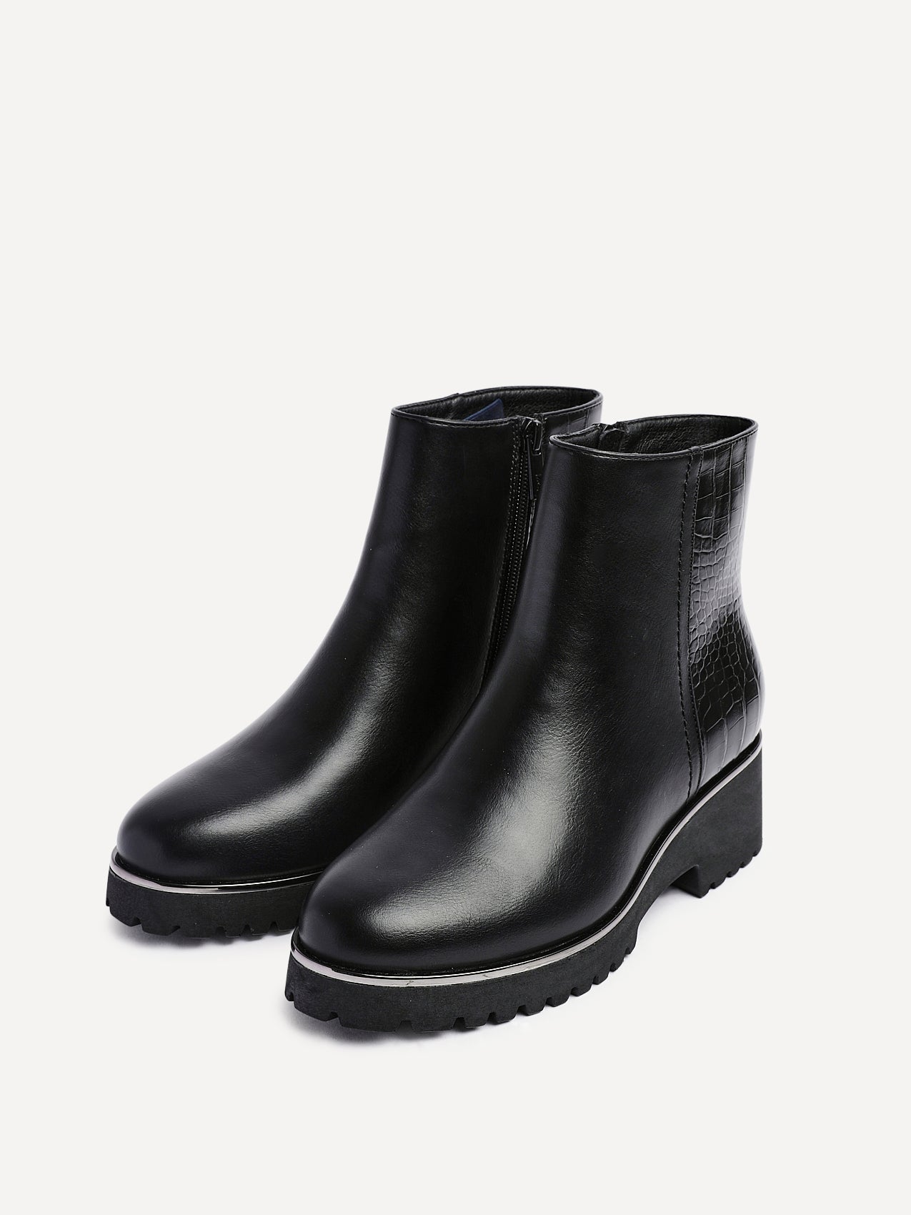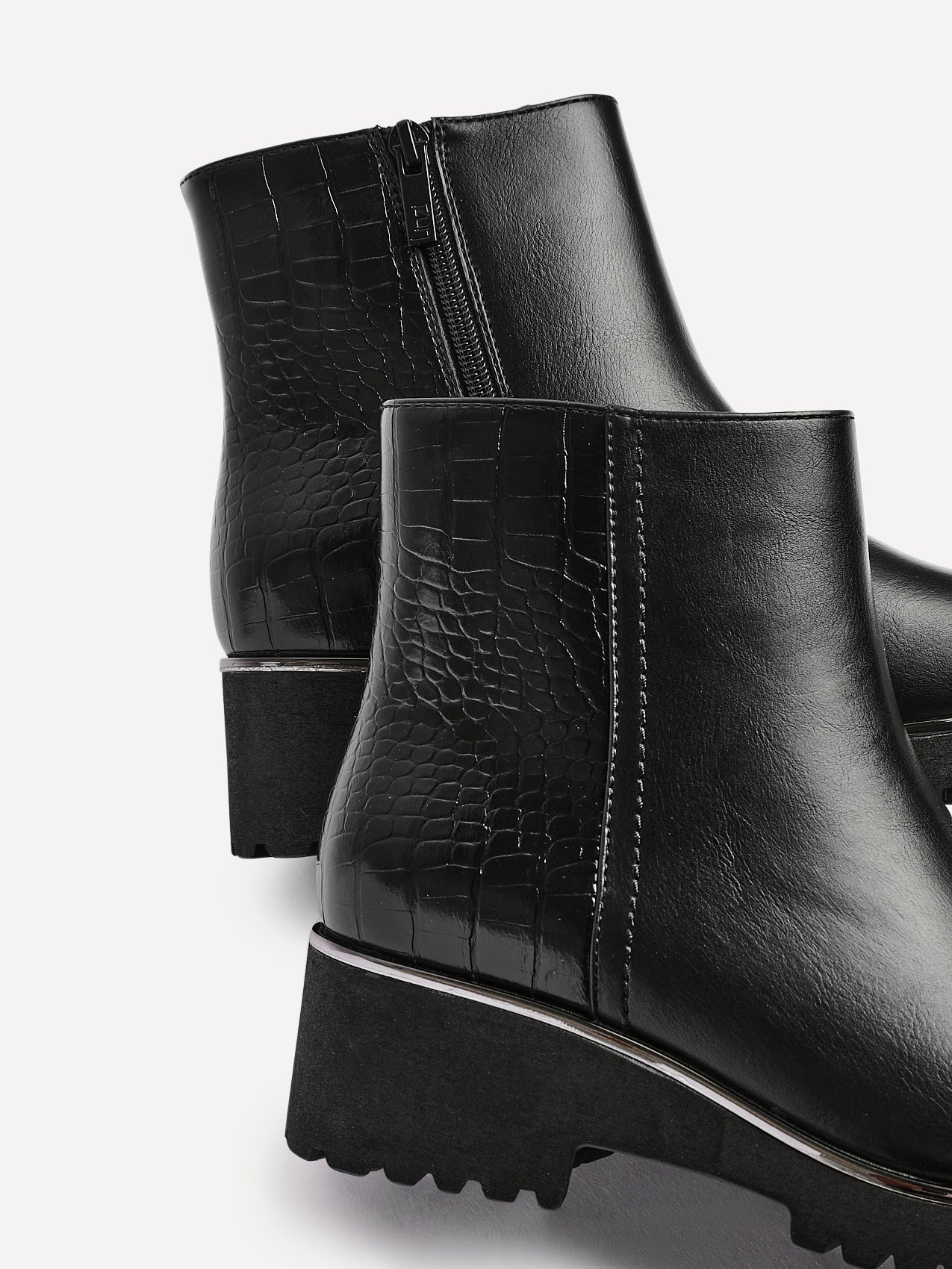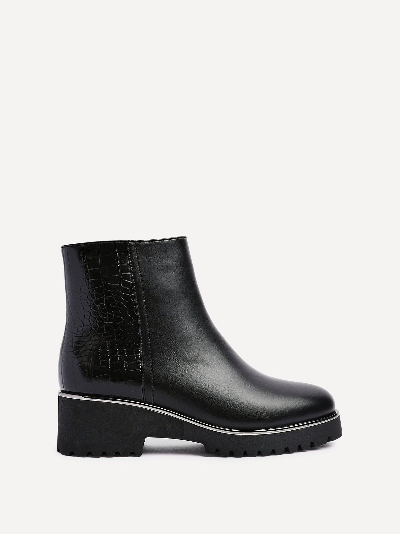 Explore the elegance of our Navigate ankle boots, highlighted by a croc-embossed heel and refined metallic detailing along the sole. Crafted for comfort, they boast a soft cushioned insole, a 5cm wedge platform, and a cosy faux fur lining.