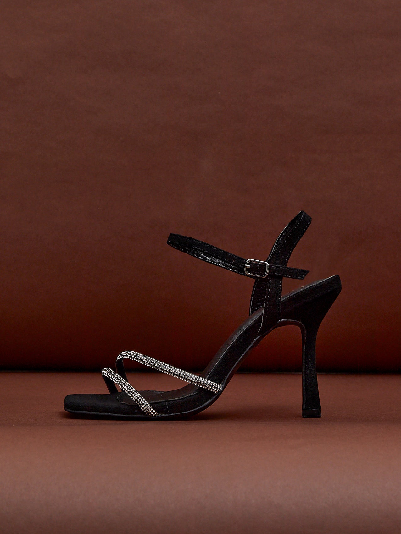 Black Faux Suede Square Toe Diamonte Embellished Heel