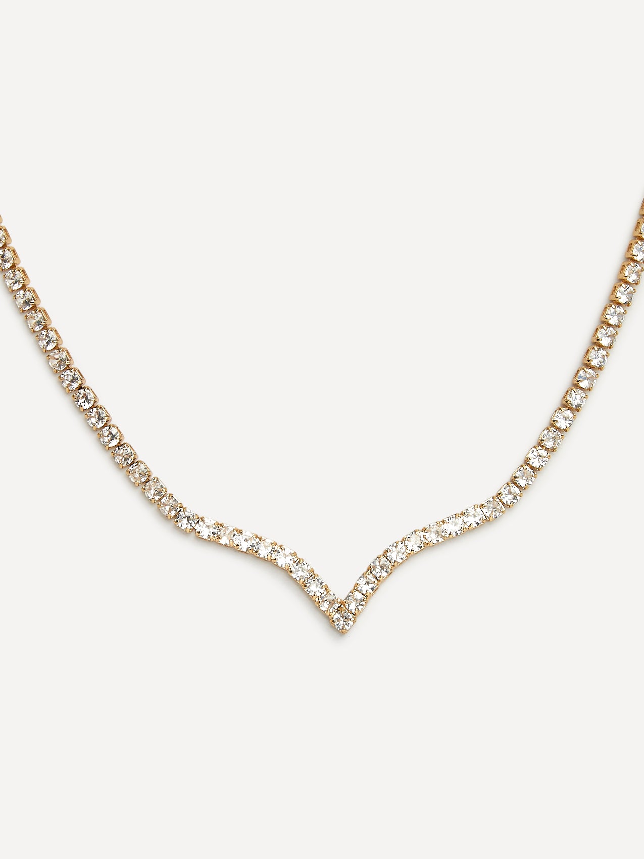 Designed to frame the neckline with just the right amount of sparkle, this V-shaped tennis necklace is adorned with a continuous row of clear crystals set in gold-plated brass. The subtle dip draws the eye and flatters the décolletage - perfect for strapless gowns and elegant updos. Classic, minimal and guaranteed to shine in every photo.