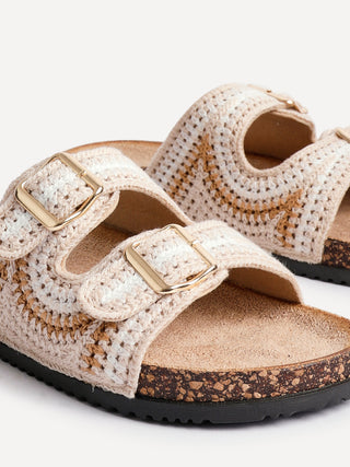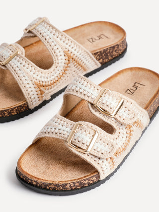 Elevate your summer style with our Jaylyn flat sandals. Featuring a sleek double front strap with buckle detailing, these sandals blend effortless elegance with everyday comfort. The intricately woven design adds a unique touch, perfect for stepping out in style this season.