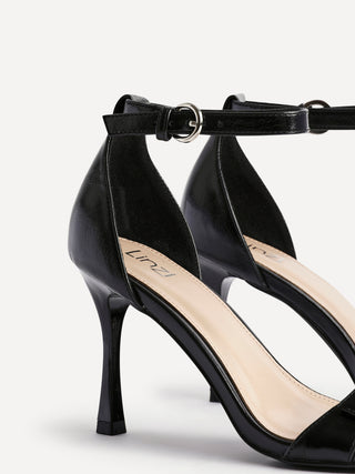 Black Faux Leather Stiletto Heeled Sandals With Buckle Detail