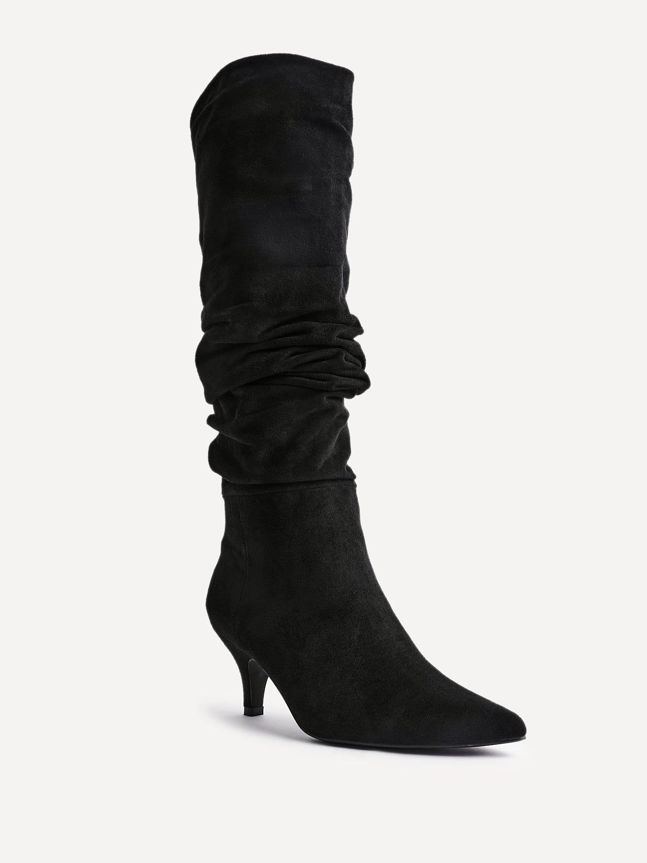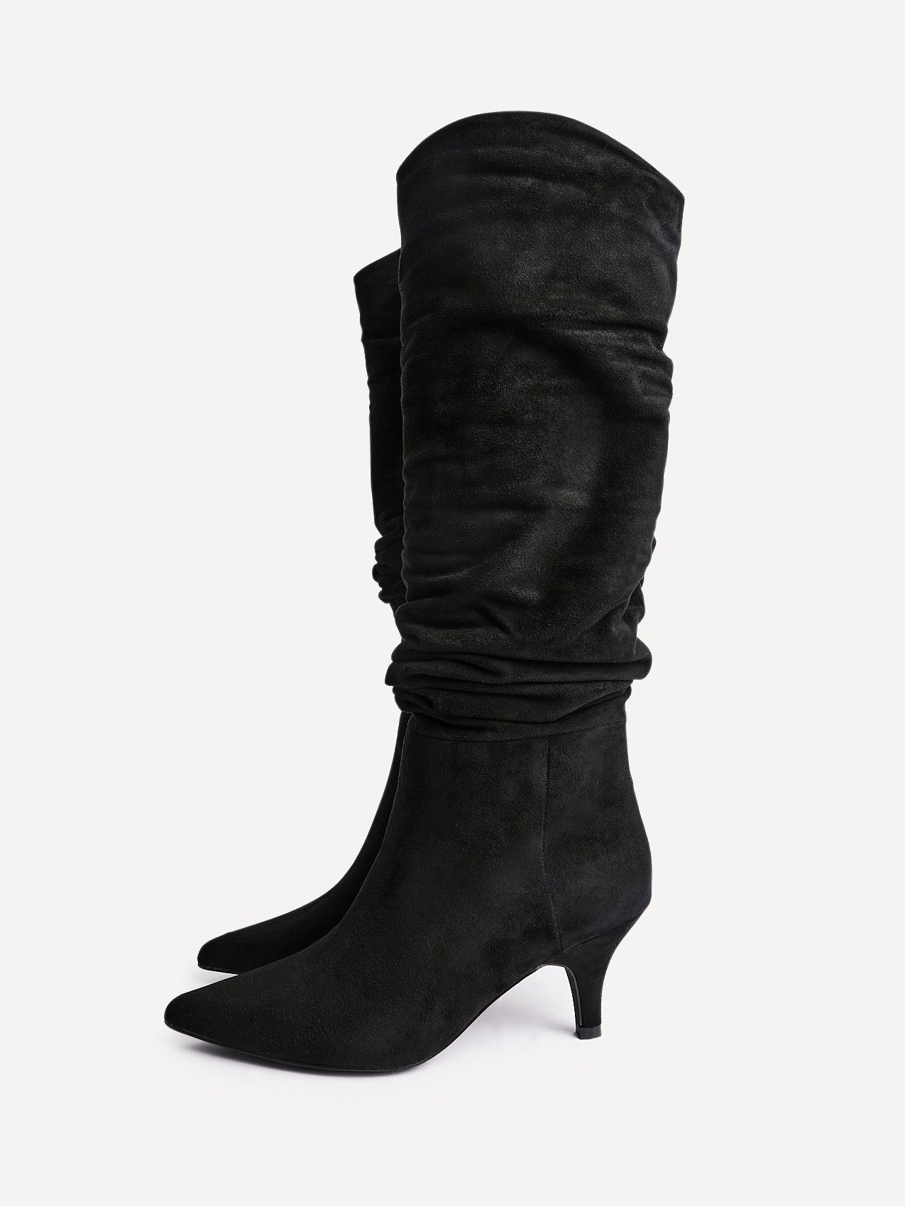 Black Faux Suede Ruched Kitten Heel Knee High Boot