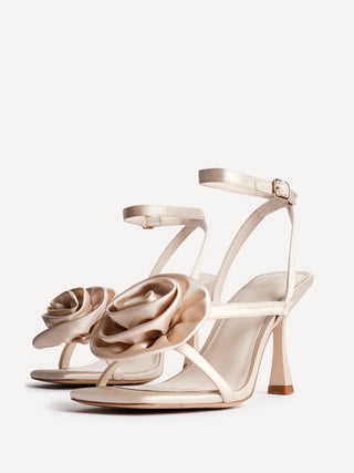 Champagne Satin Stiletto Heeled Sandals With Flower Detail